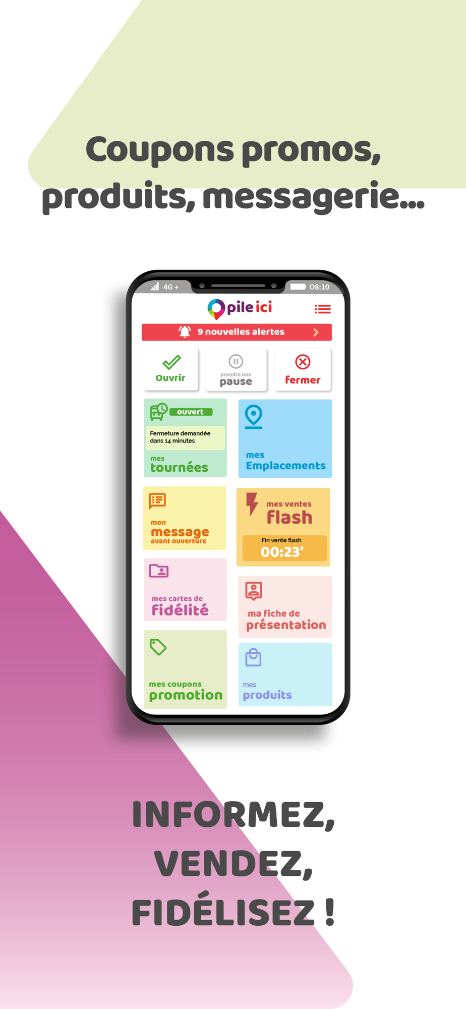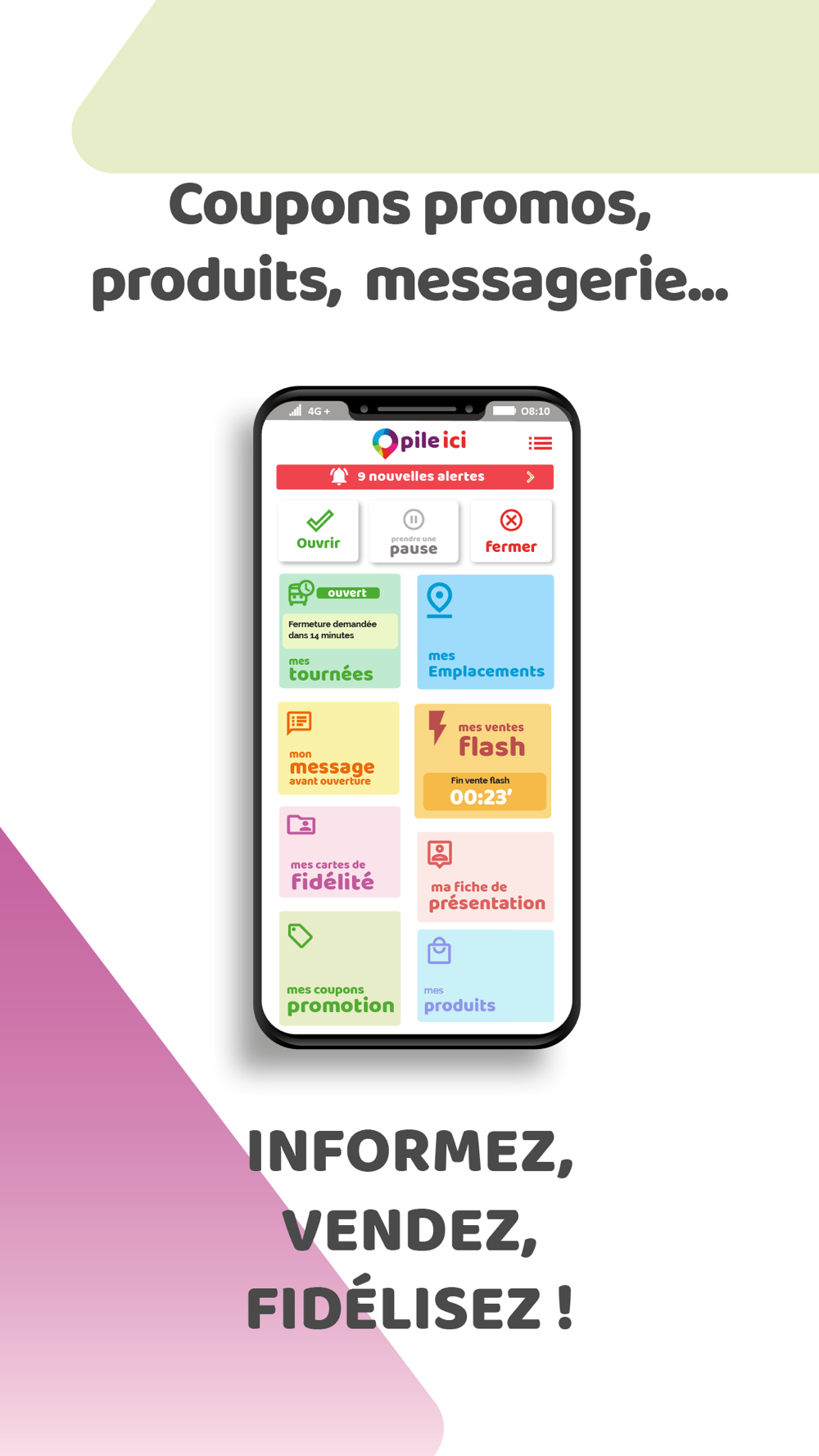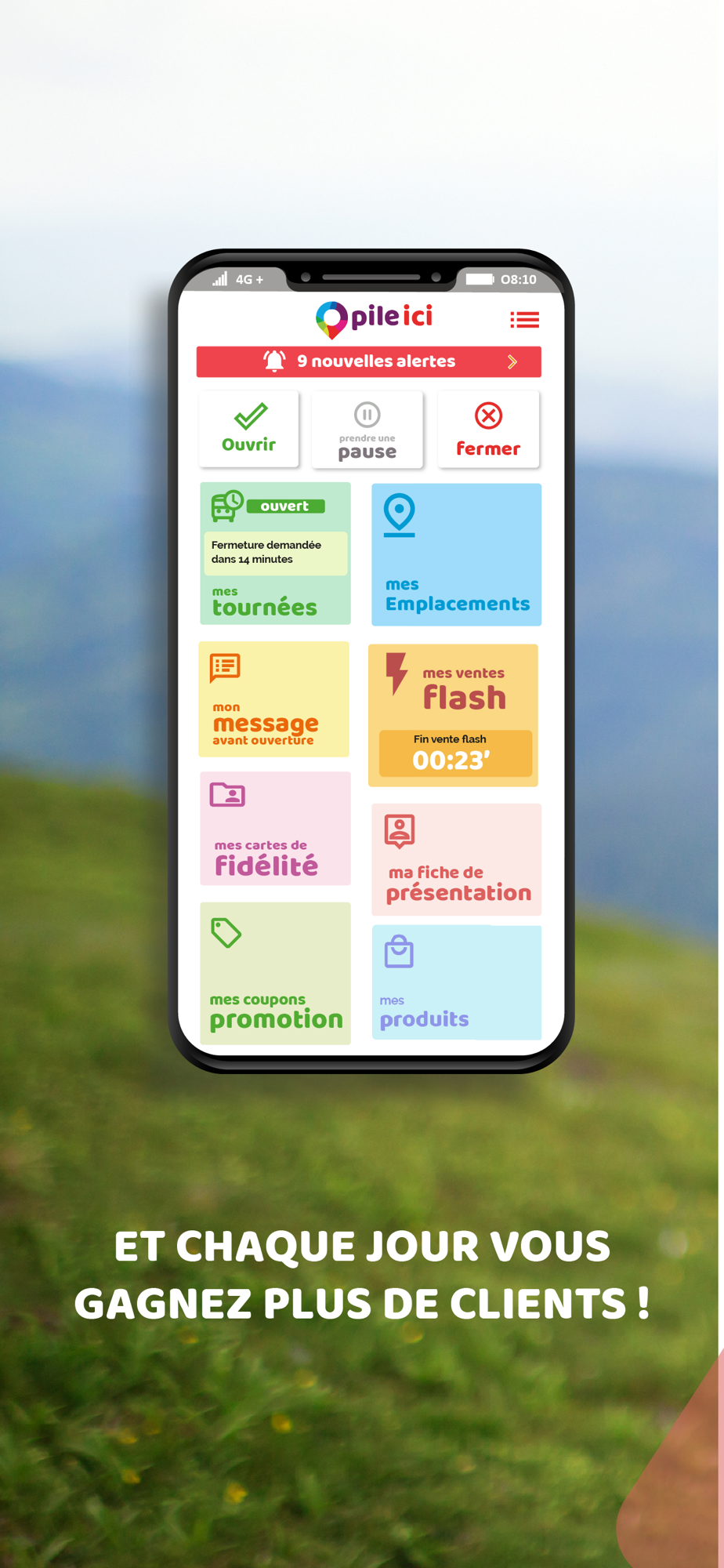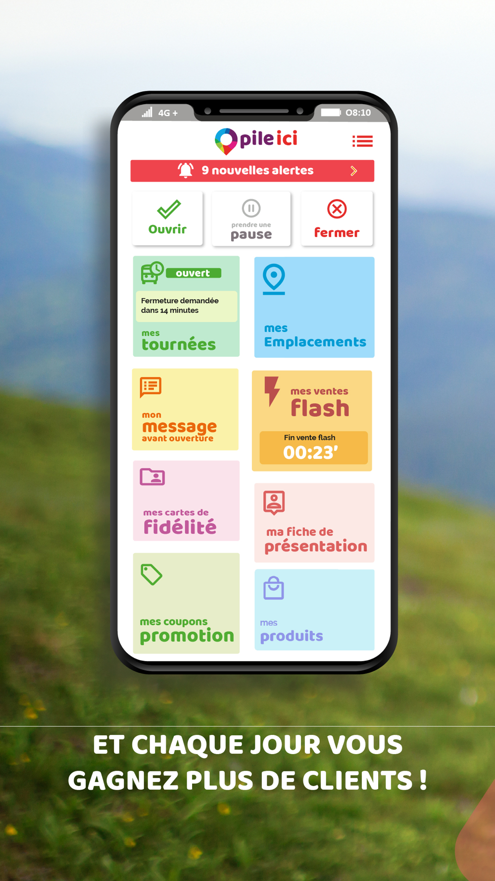 PILE ICI est la première application qui alerte et relance automatiquement vos clients mais également tous ceux qui, situés à proximité, ne vous connaissent pas encore mais pourraient être intéressés…