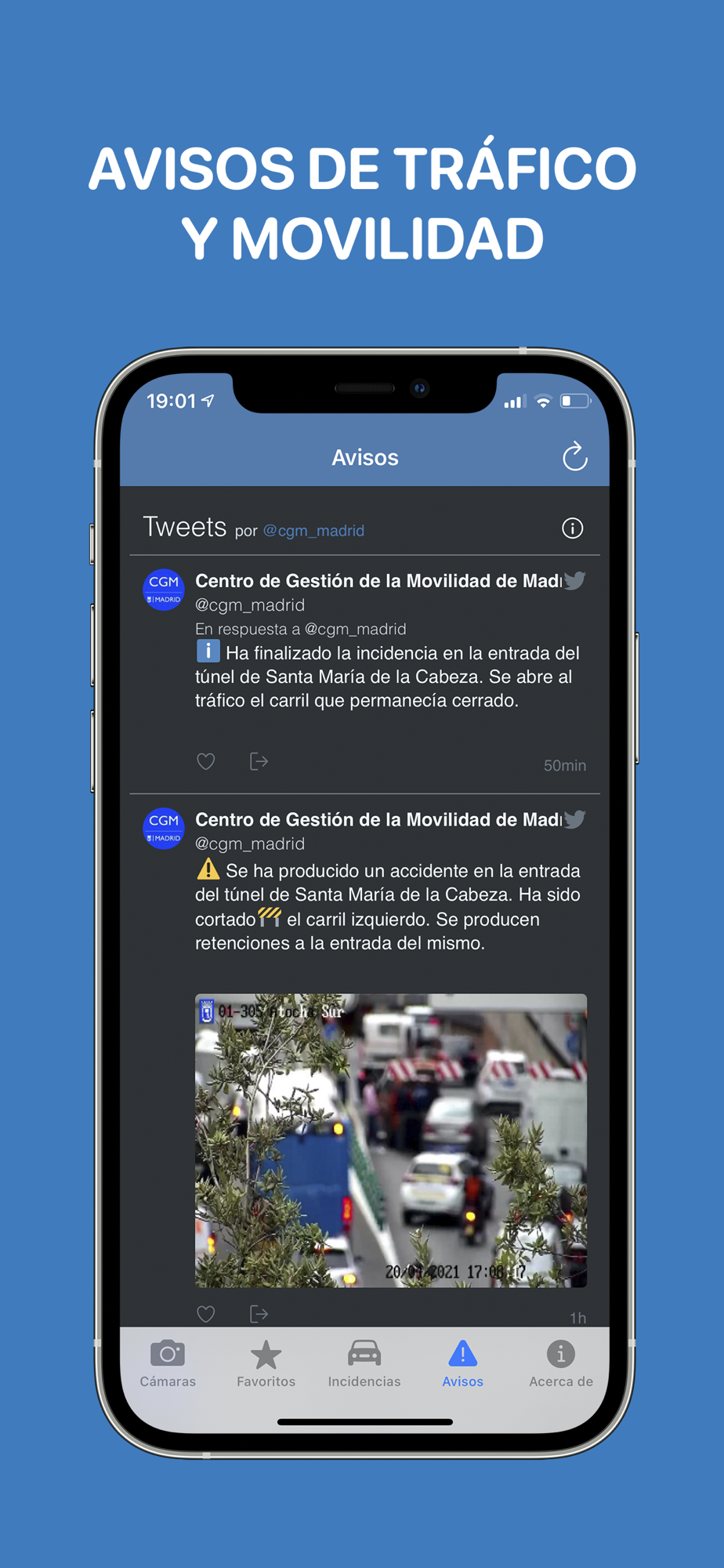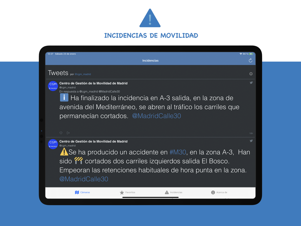 You will be able to view the incidents of the Madrid public highway, Madrid M30 and DGT:
