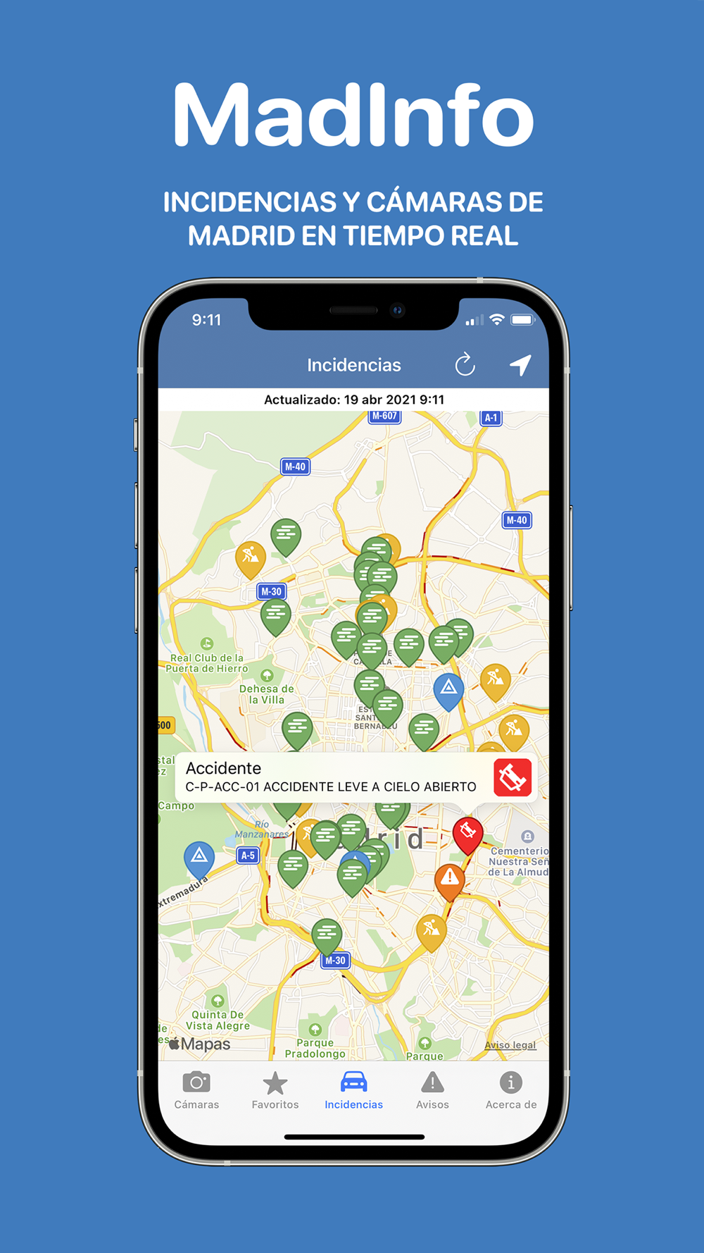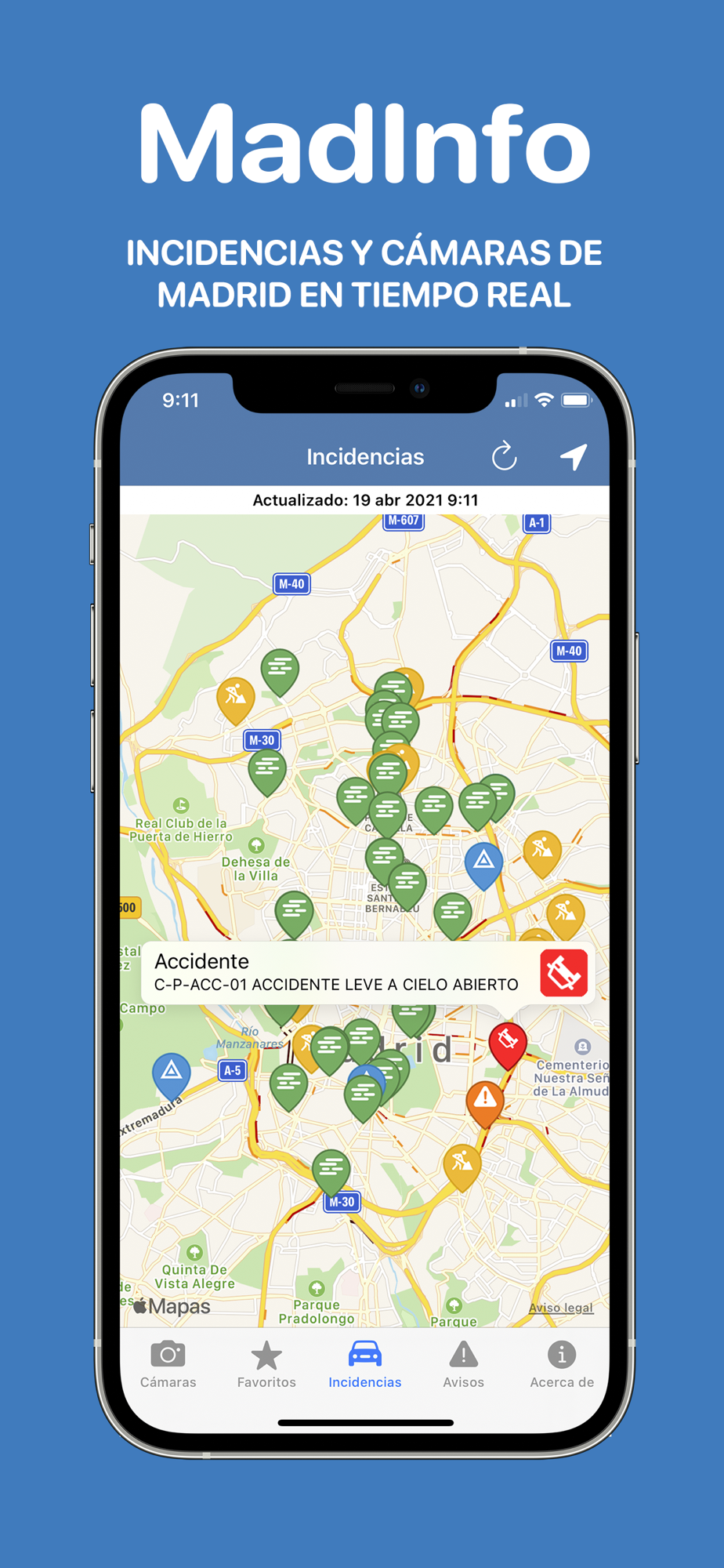 MadInfo allows you to view traffic incidents and Madrid cameras in real time in one place. Check for traffic jams before moving on the main roads and streets.