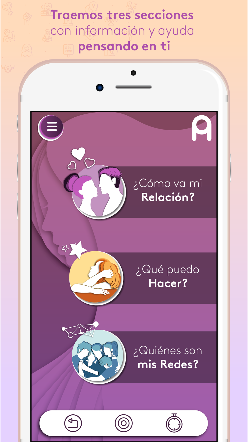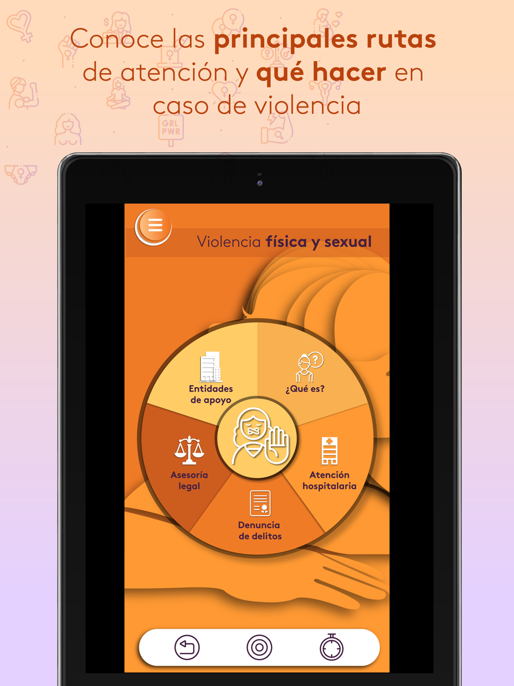 Encontrarás tres grandes secciones: en la primera llamada ¿Cómo va mi relación? podrás acceder a test para identificar la presencia de violencia psicológica, económica, física y/o sexual en tu relación de pareja y cómo te sientes actualmente en tu relación. En la segunda sección llamada “¿Qué hacer?” encontrarás una descripción de las rutas de atención para los diferentes tipos de violencias, tips de relaciones saludables y acciones alternativas enfocadas en tu trabajo personal para prevenir la aparición de violencia en tu relación. Finalmente, en la tercera sección llamada “¿Quiénes son mis redes?” podrás conocer testimonios y conectar a través de redes sociales con otras mujeres que han vivido experiencias similares a la tuya.