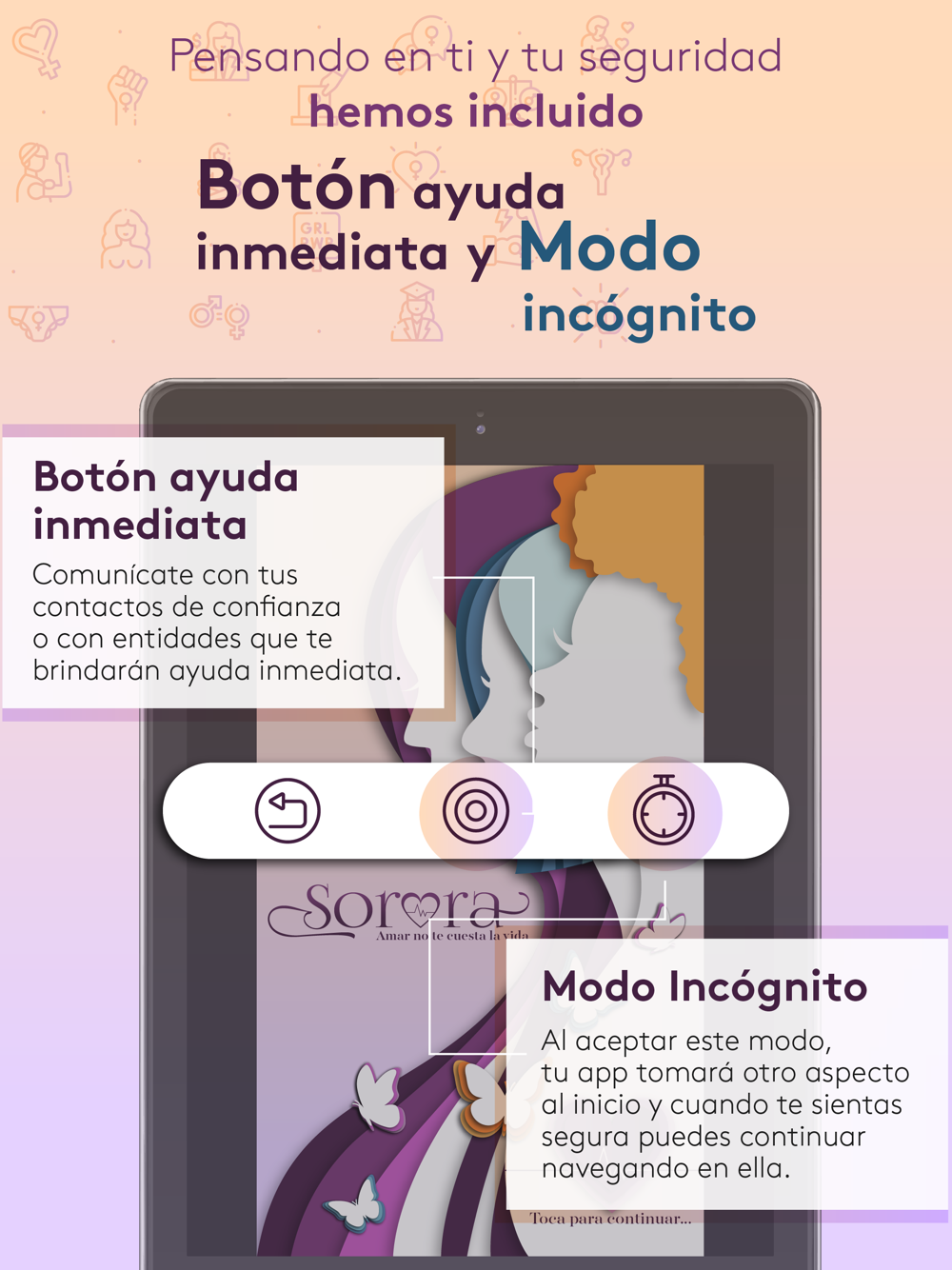 SORORA significa hermandad, apoyo, respeto y unión entre mujeres. Esta aplicación quiere ser tu aliada para identificar la presencia y los tipos de violencias en tu relación de pareja, conocer qué acciones puedes llevar a cabo para frenarlas o prevenirlas y conectar con otras mujeres para compartir tus experiencias y darse apoyo mutuo.