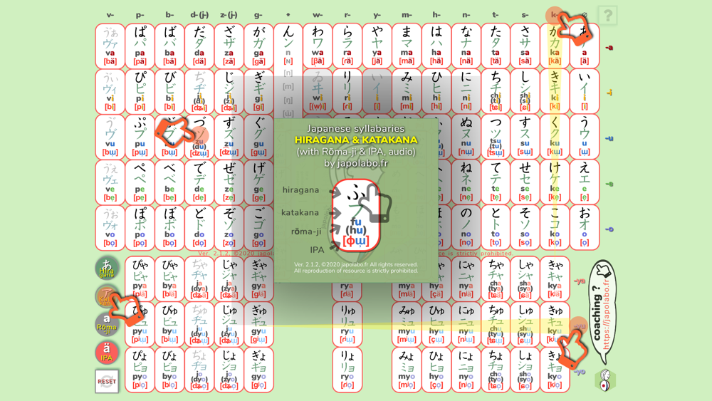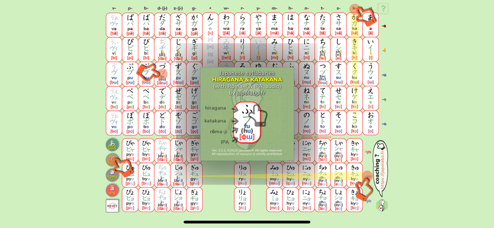 2) Using a small feature "hide and seek" (buttons at the bottom left), let's memorize Hiragana, Katakana, Rōma-ji (romanization of Japanese) and IPA (International Phonetic Alphabet).