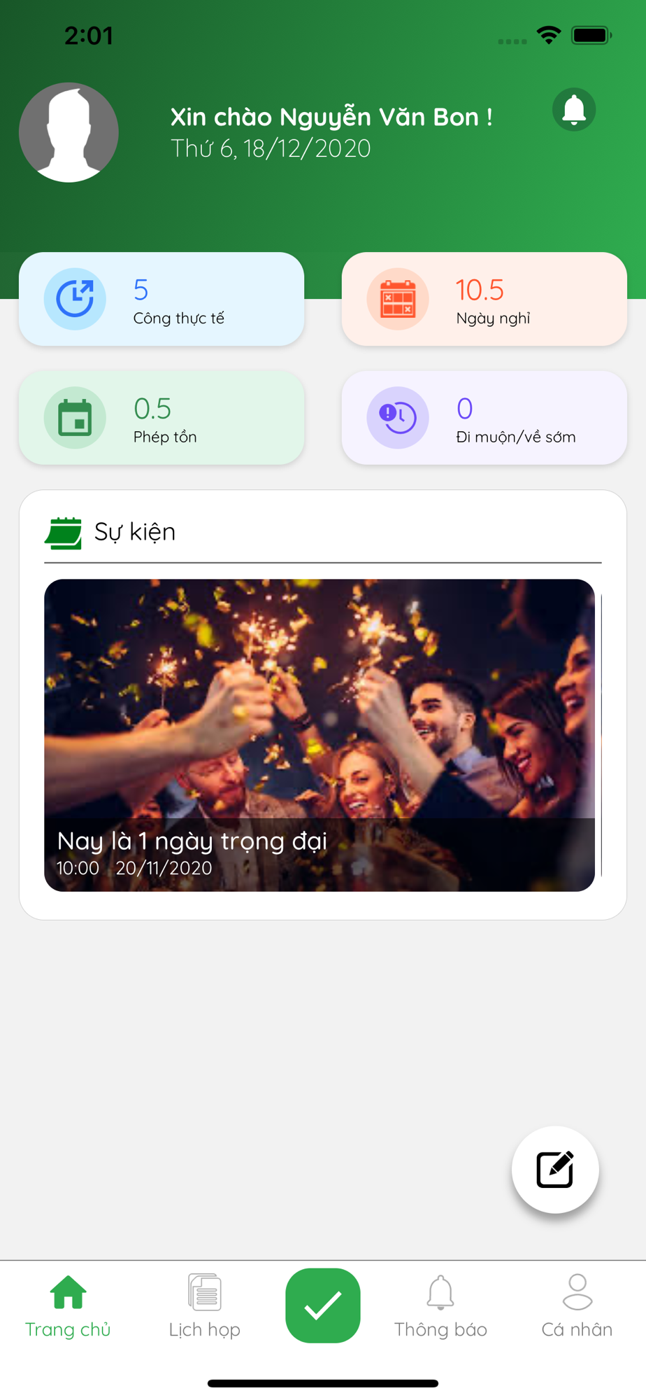 Thực hiện các tính năng quản lý nhân viên. Người dùng có thể chấm công, xin nghỉ phép, đặt lịch phòng họp, hiển thị thông tin cá nhân và các tin tức từ công ty.
