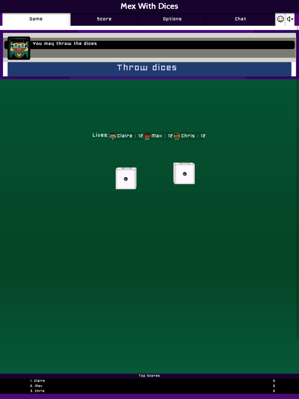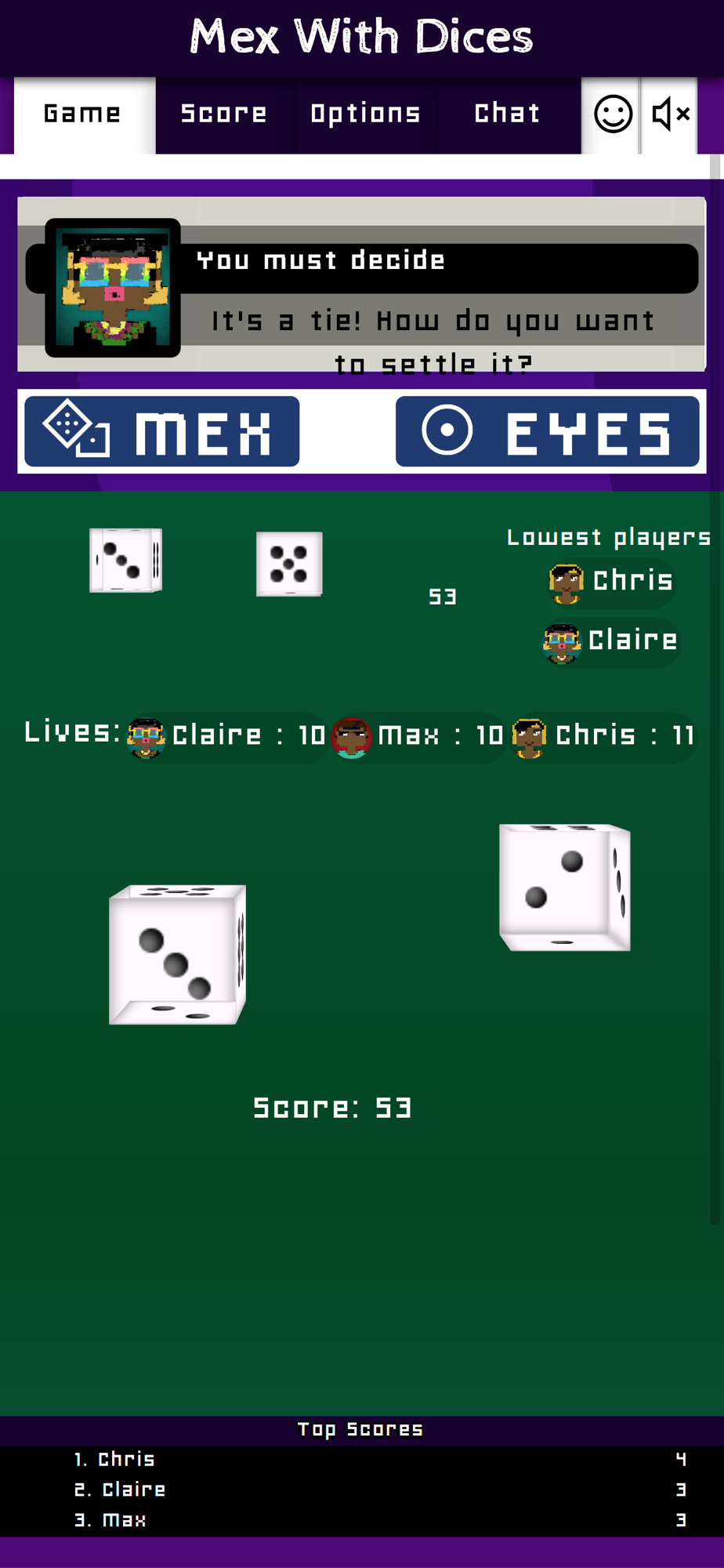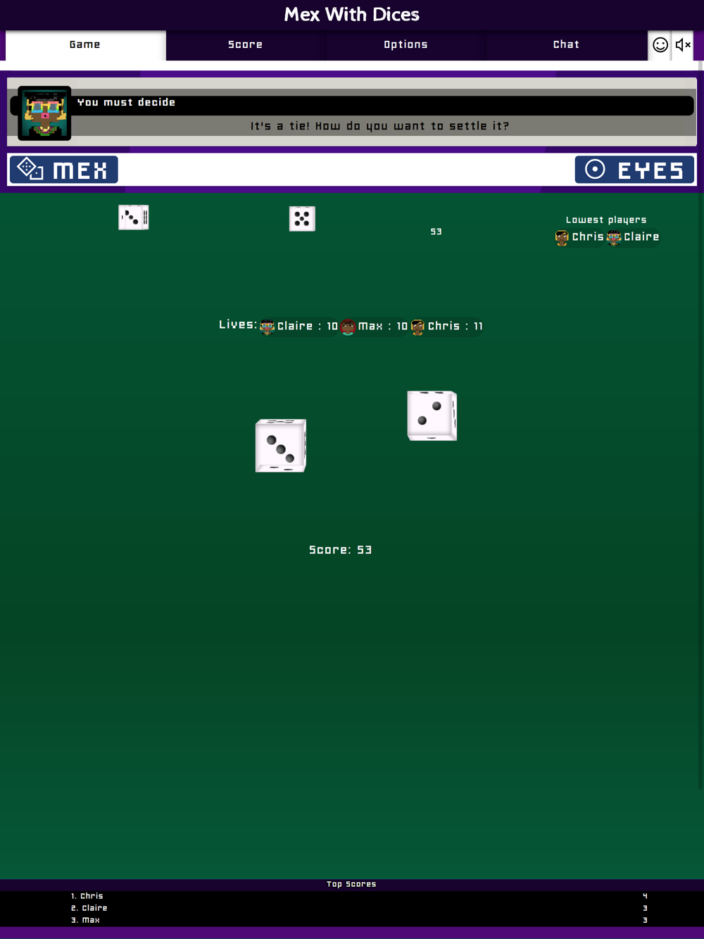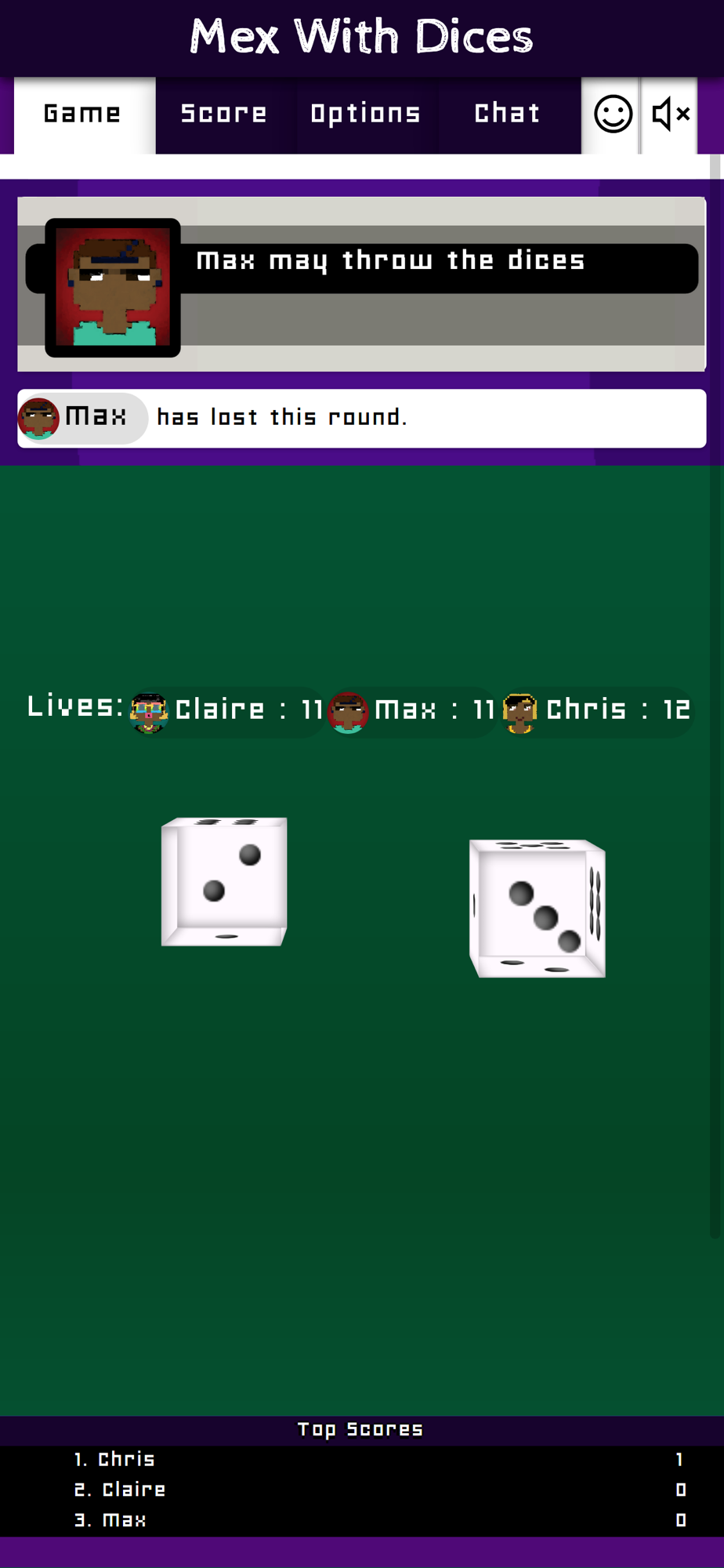 Each player starts with 12 lives. The loser of a round is the one who has thrown the lowest score of all players and gets 1 penalty point (or more, if a mex has been thrown). As long as you have lives left, you stay in the game. If your lives reach 0 (or lower) you are out of the game. The other players continue to play until there is only 1 player left. The number of starting lives can be set in the game options.