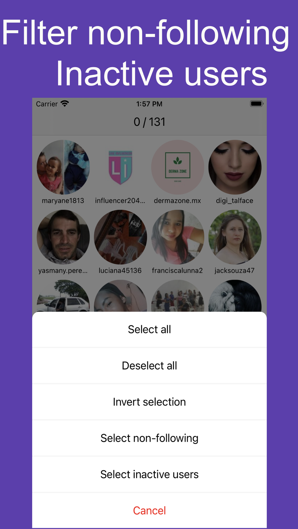 - Quick selection tools (Inactive users, Non-followers, etc)