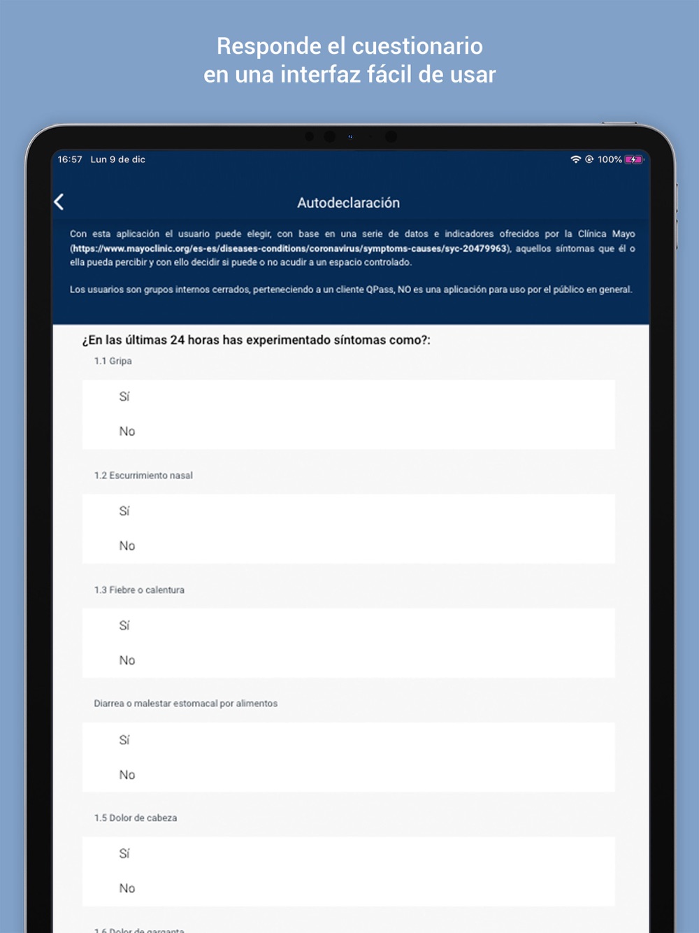 Con QPass Empleados puedes acceder a un centro de trabajo o un espacio restringido controlado por QPass, creando un Código Dinámico único e irrepetible, específico para ese punto de control. Llena unas preguntas sobre tus interacciones en días pasados y genera todos los Códigos Dinámicos que quieras durante el día.