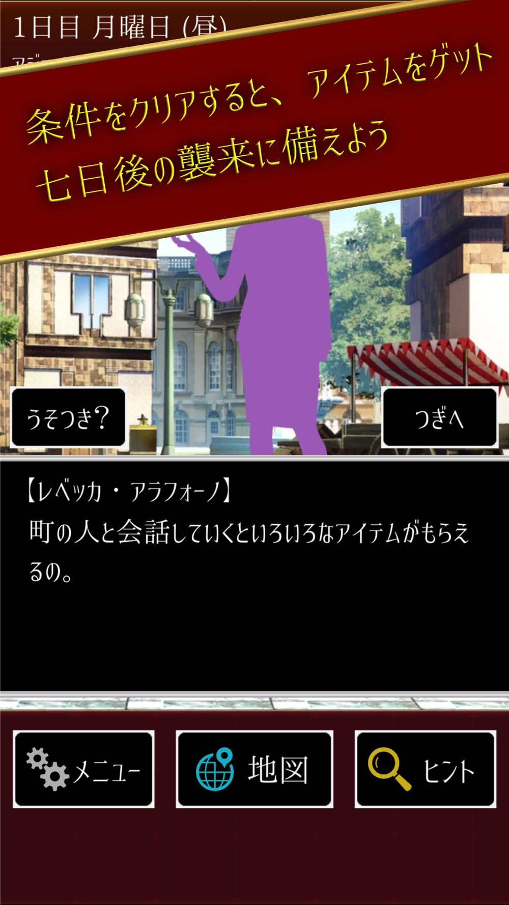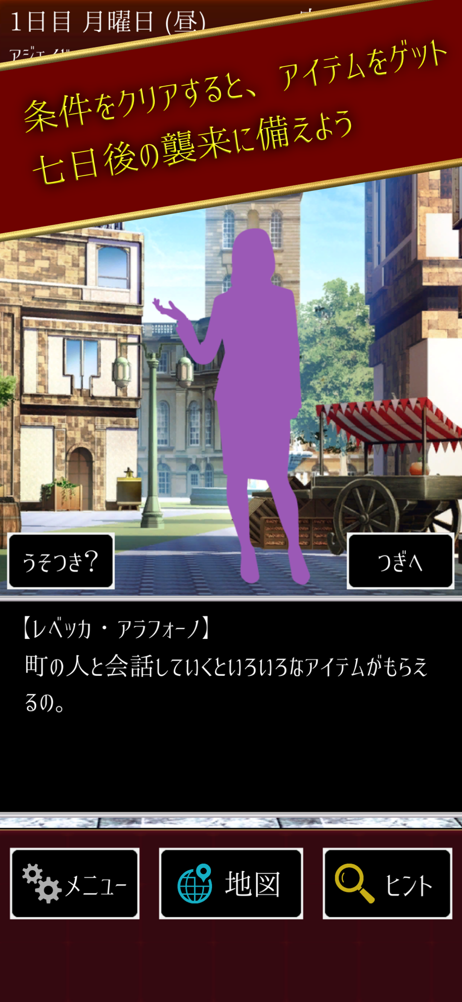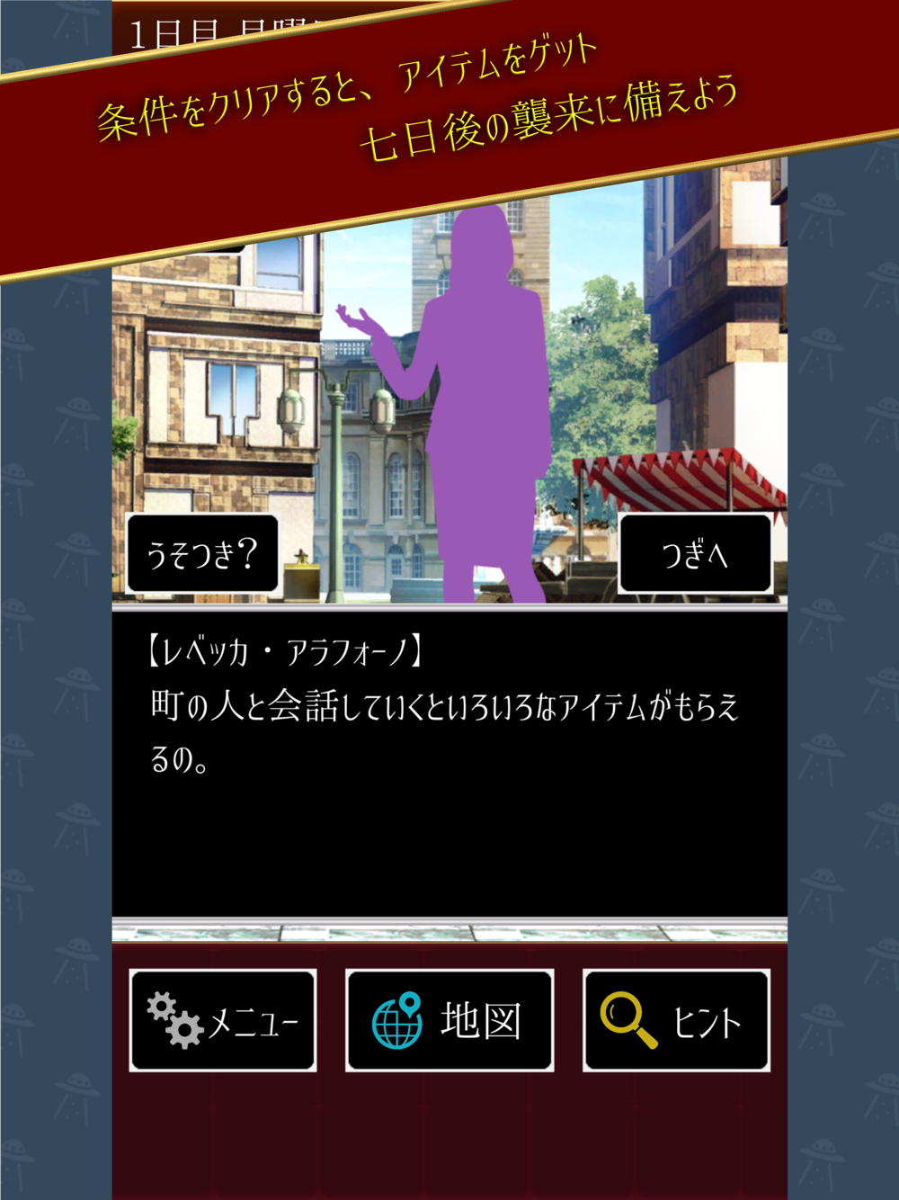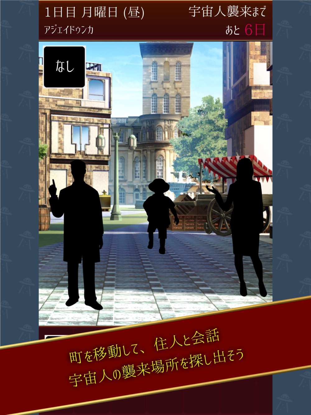 1日ごとに町を移動して、そこの住人と会話をしながら、七日目に宇宙人の襲来する場所を見つけることができればクリアとなります。