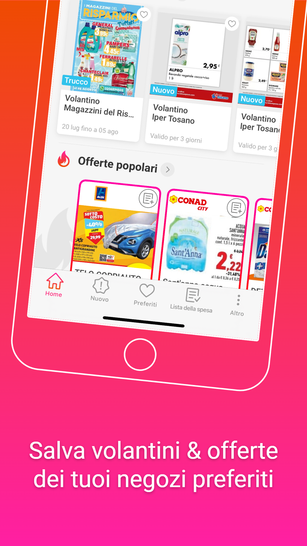 La nostra app "Offerte e volantini Italia" ti offre tutti i volantini più recenti dei piccoli negozi e delle grandi catene d’Italia: non solo di supermercati e grossisti, ma anche di negozi di elettronica, di abbigliamento, di giocattoli, di farmacie e molto altro. Abbiamo persino incluso la maggior parte dei negozi locali. Se desideri aggiungere un negozio ai preferiti potrai farlo semplicemente cliccando sull’icona a forma di cuore. In questo modo sarai sempre il primo a ricevere notifiche sugli sconti organizzati dai tuoi negozi di fiducia, e potrai anche creare una pratica raccolta di volantini che ti interessano.