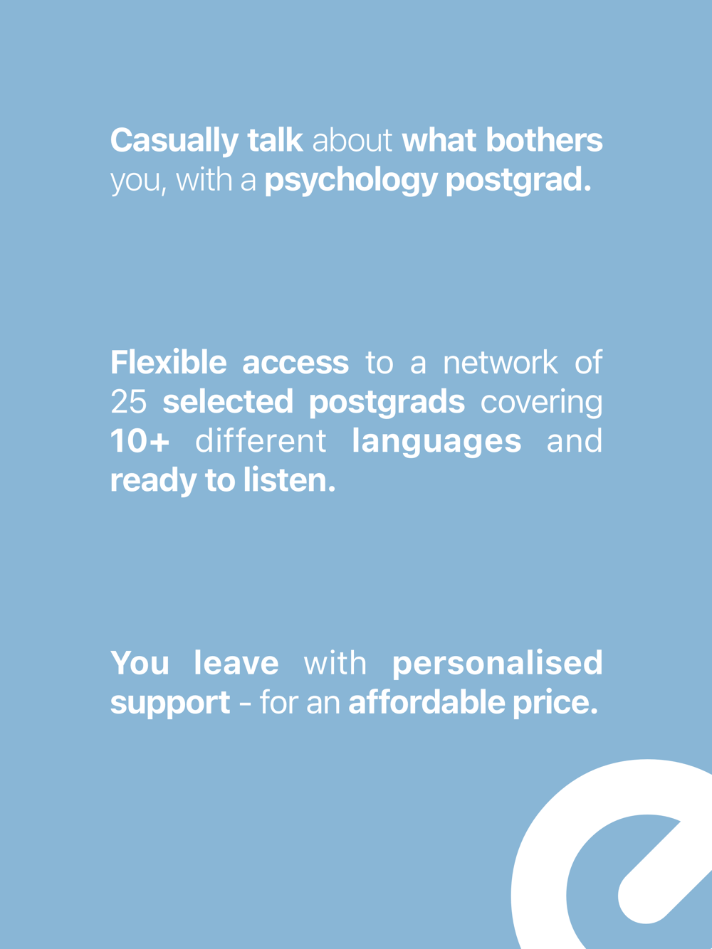 - Casually talk about what bothers you with a vetted psychology postgrad.