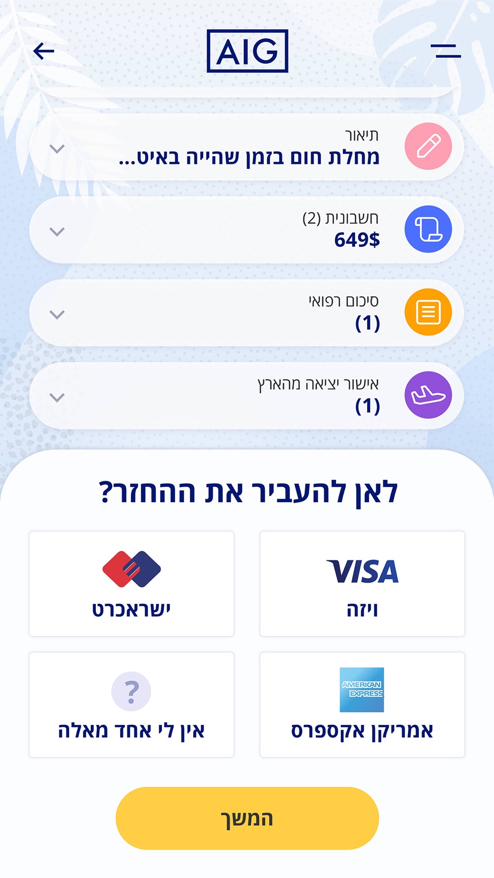 הורדת את האפליקציה ואין לך עדין ביטוח נסיעות לחו"ל? כל מה שצריך לעשות זה להיכנס לאפליקציה ולרכוש לך ולמשפחה שלך ביטוח נסיעות לחו"ל של AIG.