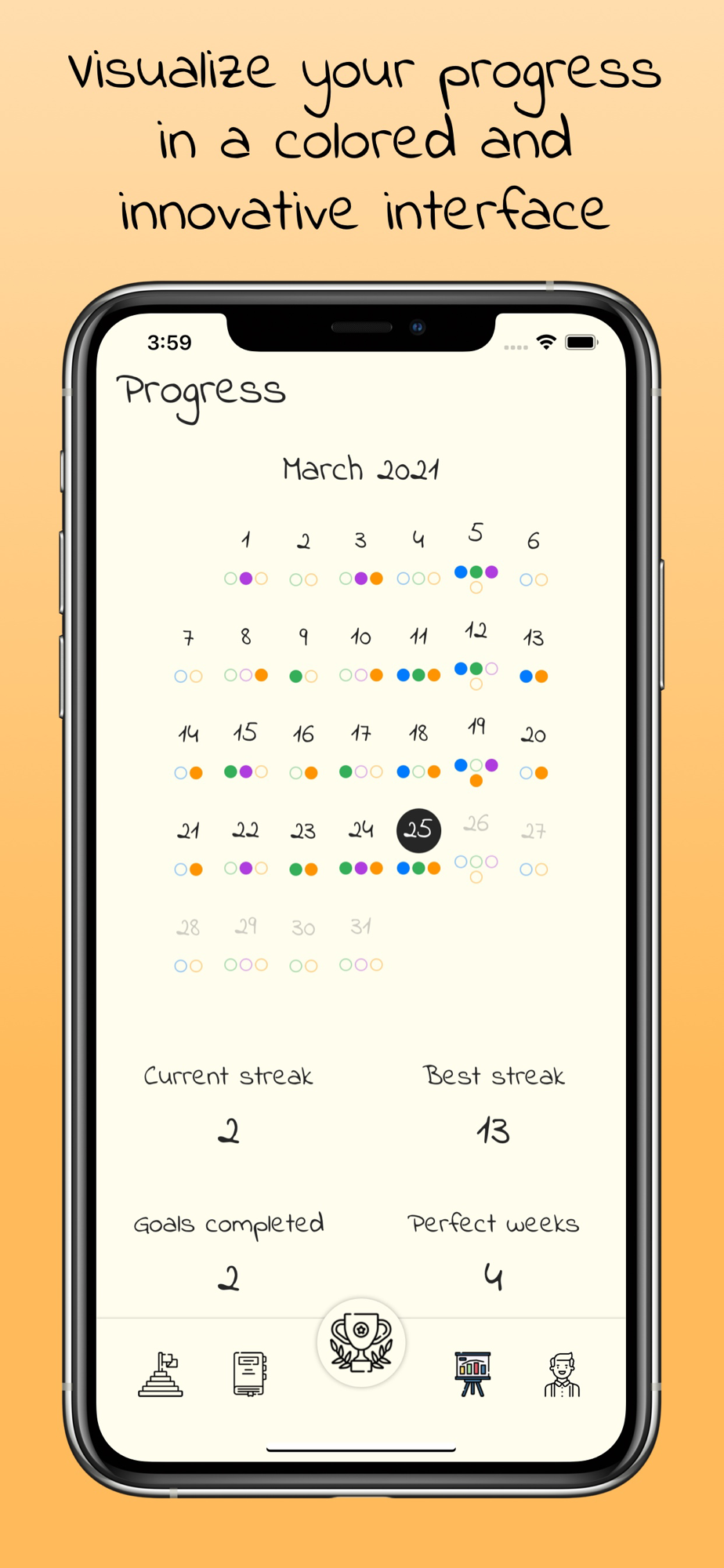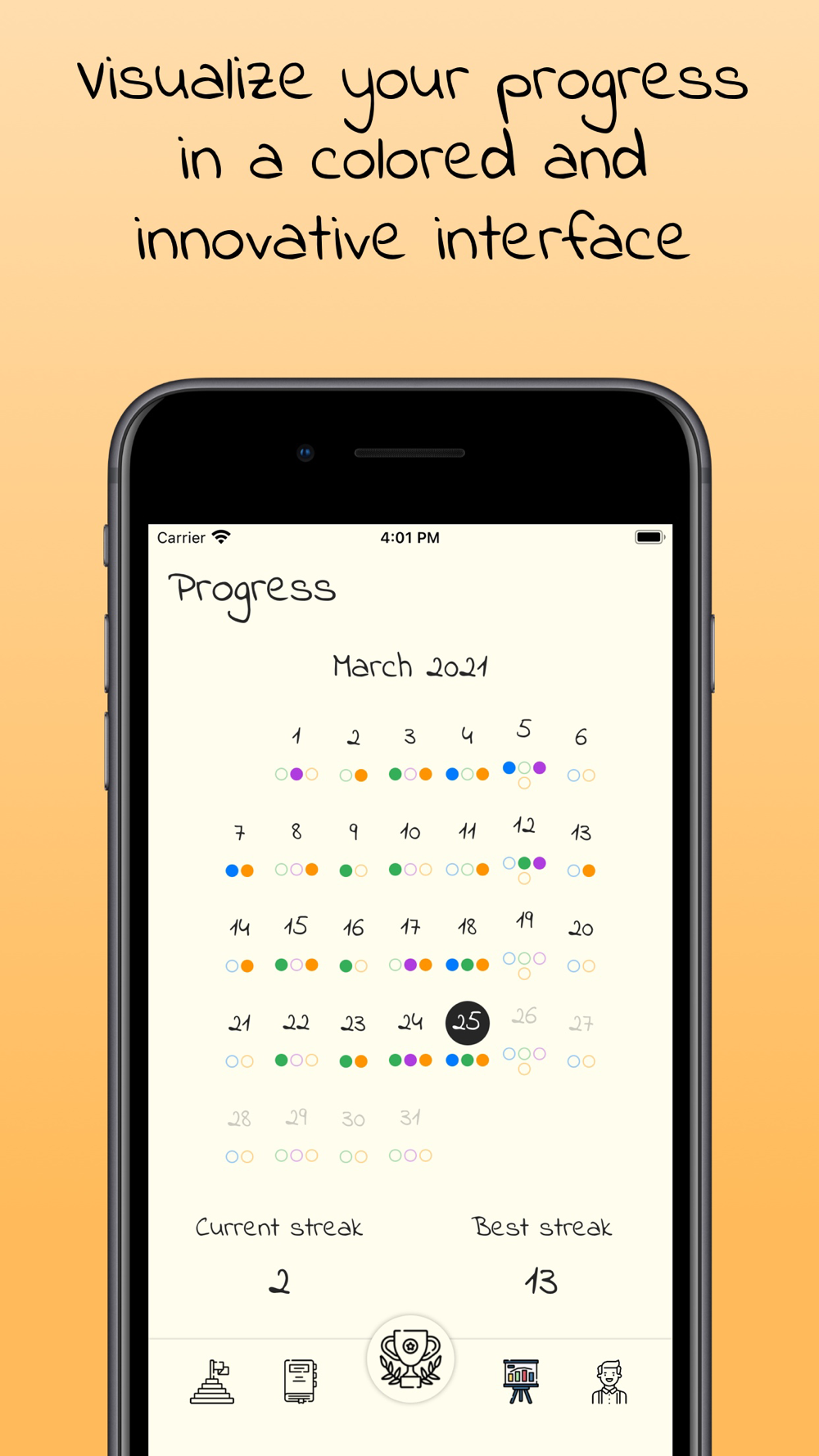 Constantly check the calendar to know your progress, where you'll have also important statistics to keep track of your daily work. Achieve several challenges, gain medals, customise your avatar, and so much more!