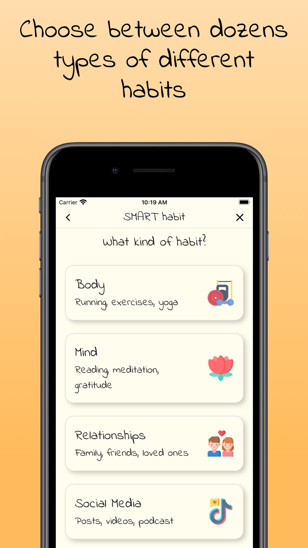 • Different habits categories (body, mind, productivity, home) plus the opportunity to create custom ones