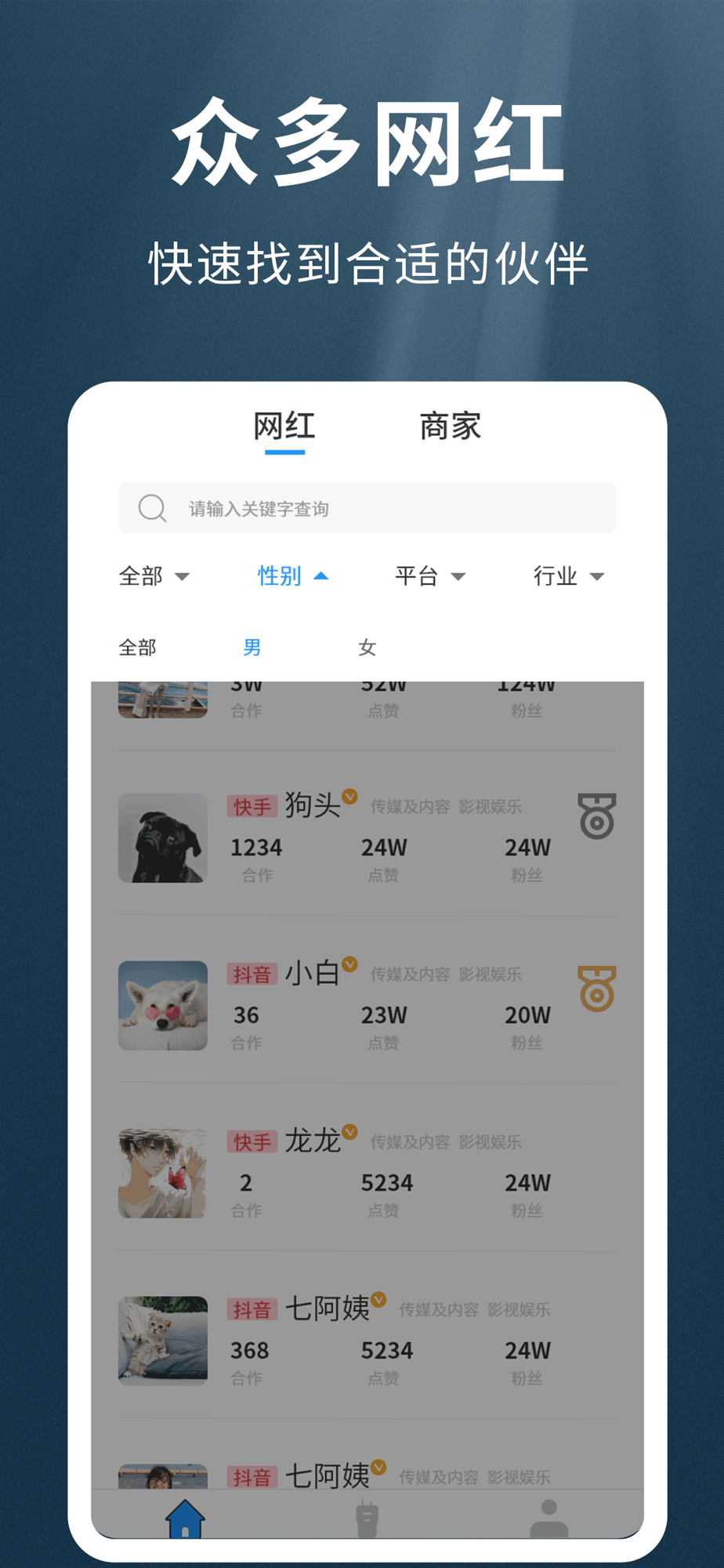 「商家找网红」想找网红带货、直播、推广、宣传,可以通过MCN平台发布合作请求,电商商家、线下商家、企业机构、小团队、MCN,都有优质的网红带货主播帮你包装、营销、推广和变现。