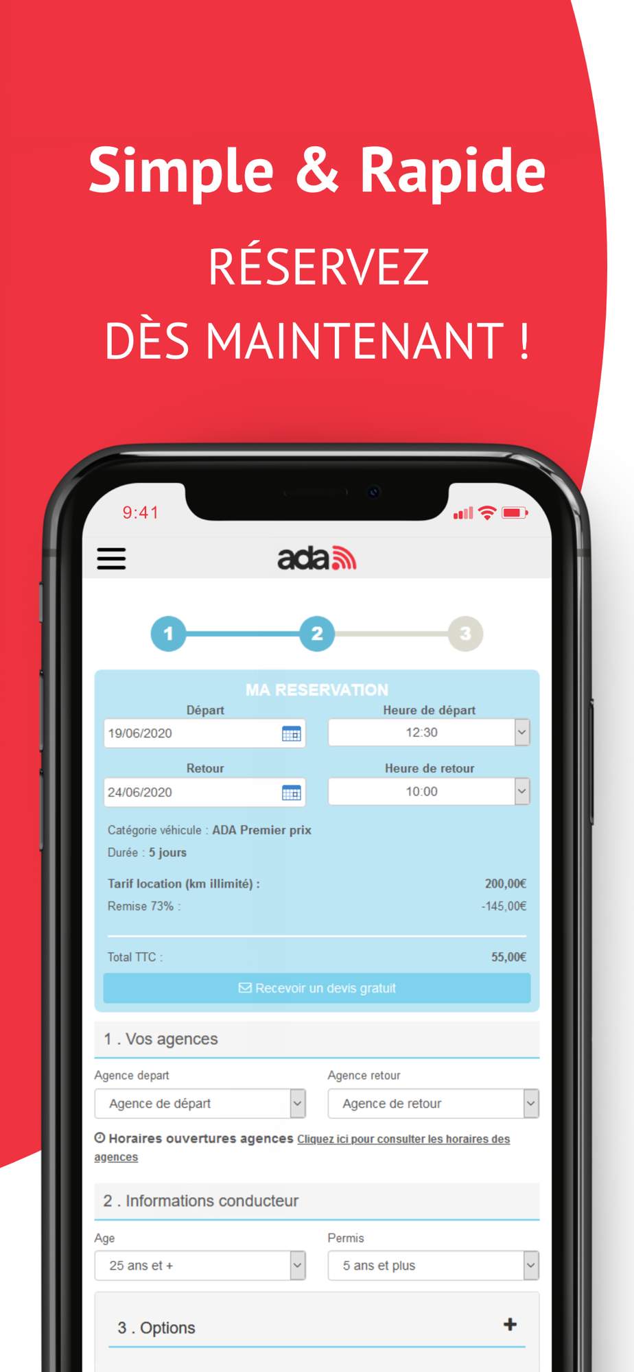 Réservez votre voiture, un scooter ou un utilitaire rapidement sur l'application ADA Réunion. Choisissez le modèle qui vous convient, l'agence et vos horaires.