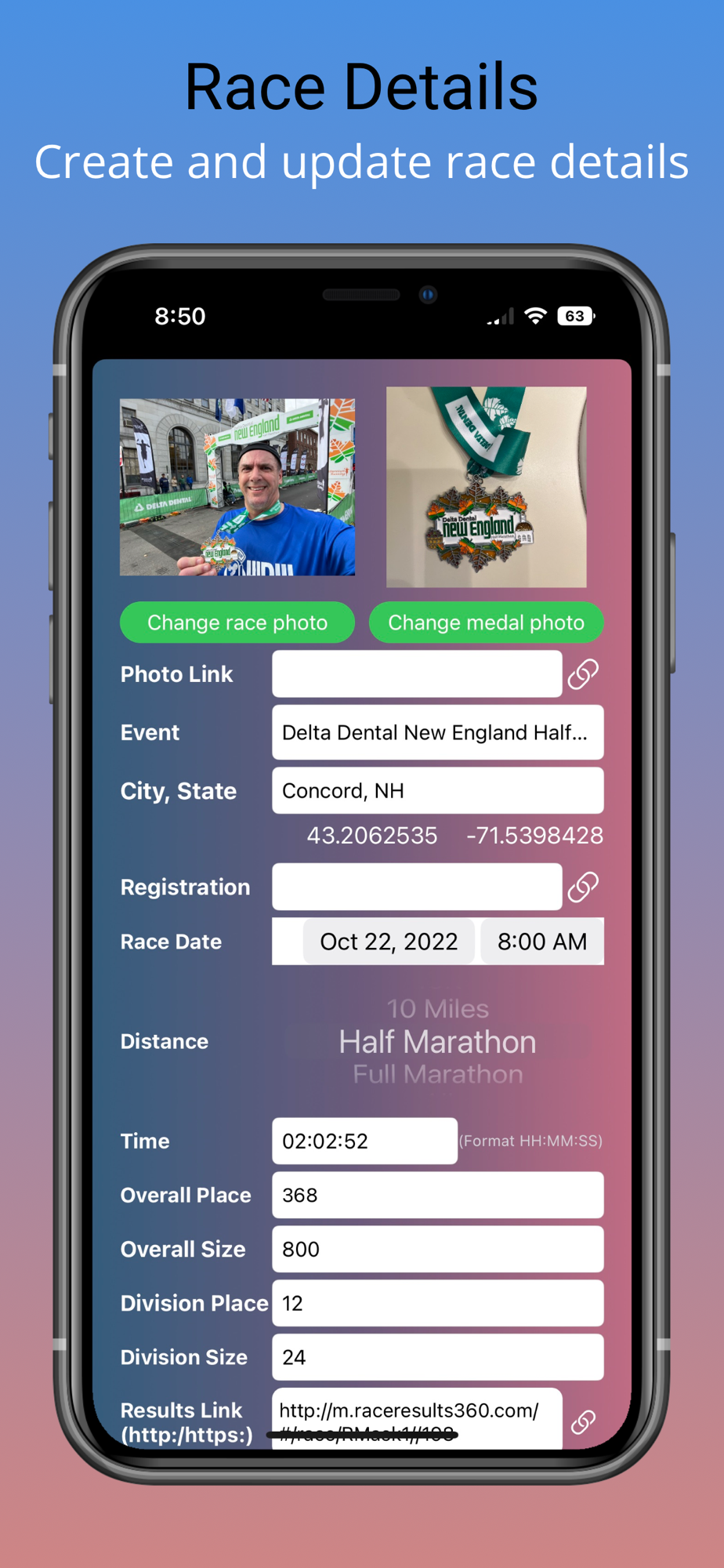 6. Customizable race distances (5K, 10K, Half Marathon, Full Marathon loaded by default)