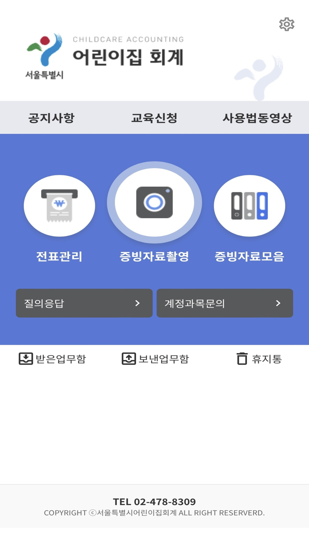 어린이집에서 구매한 구매물품 영수증 등록, 관리를 할 수 있고 어린이집 관리시스템 교육일정을 확인하고 신청하는 기능을 제공합니다.