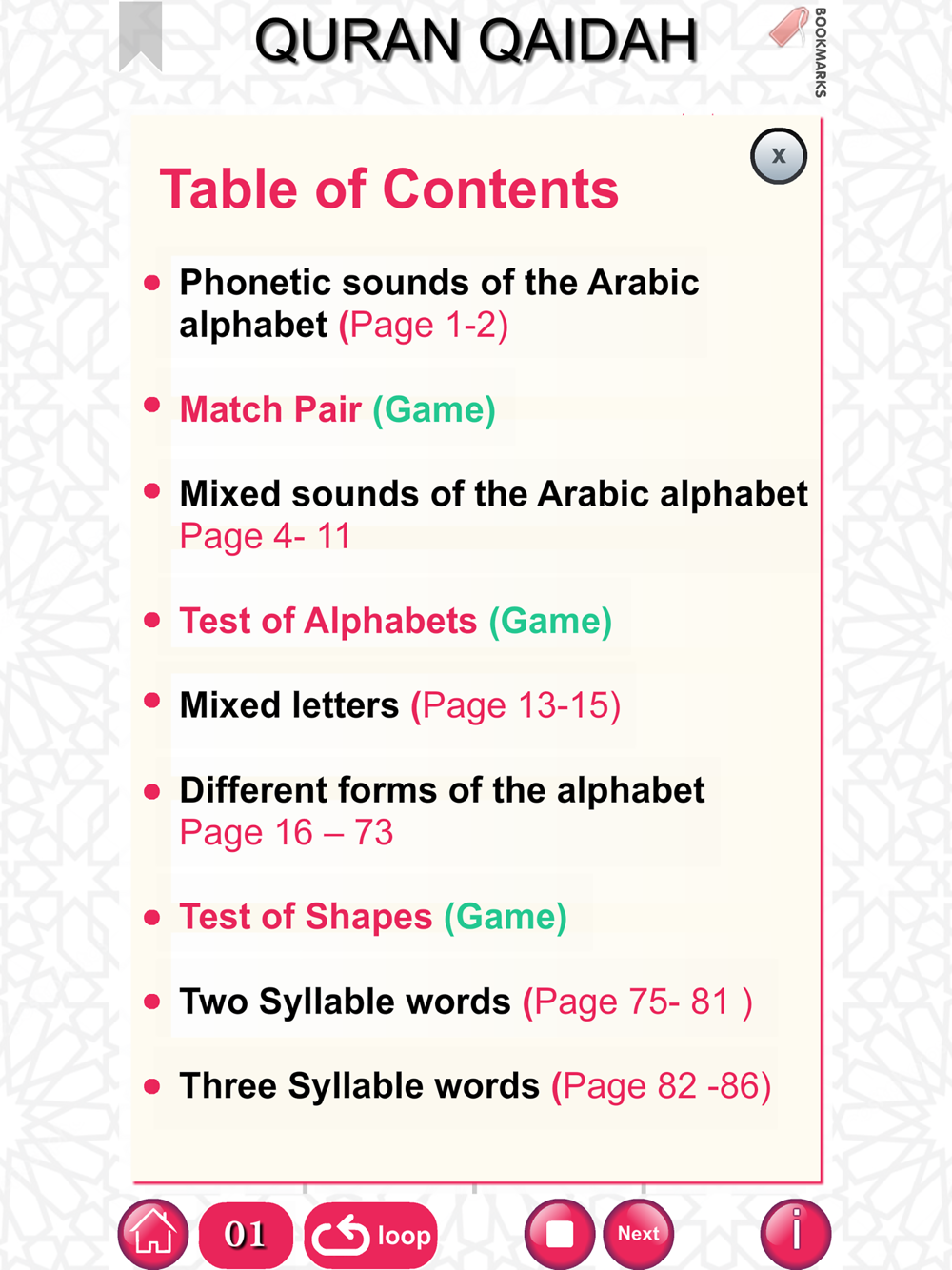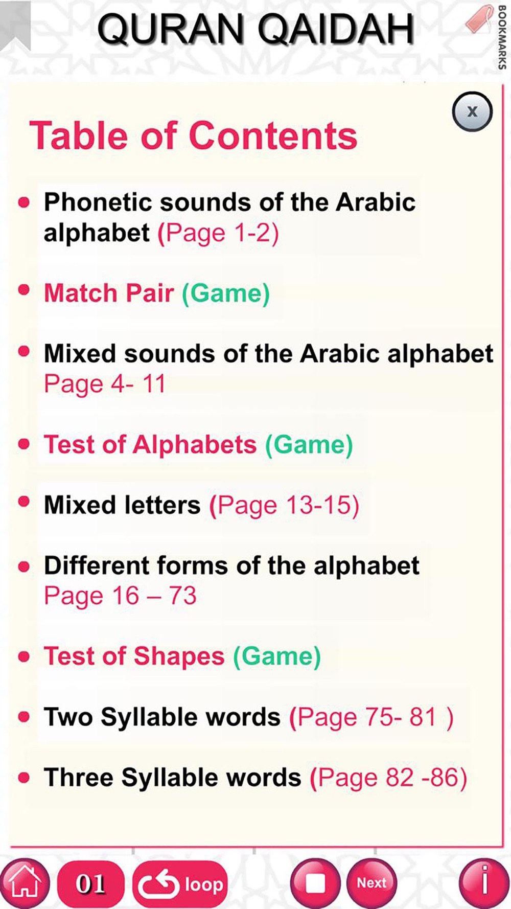 User can click individual letters/words to listen, or to play the whole page, he can click on lower play button or heading of the page. Loop button will be used to sound one time or infinite time, depending on the label of this button. User can bookmark any page via top bookmark buttons to add or open bookmarks added earlier.