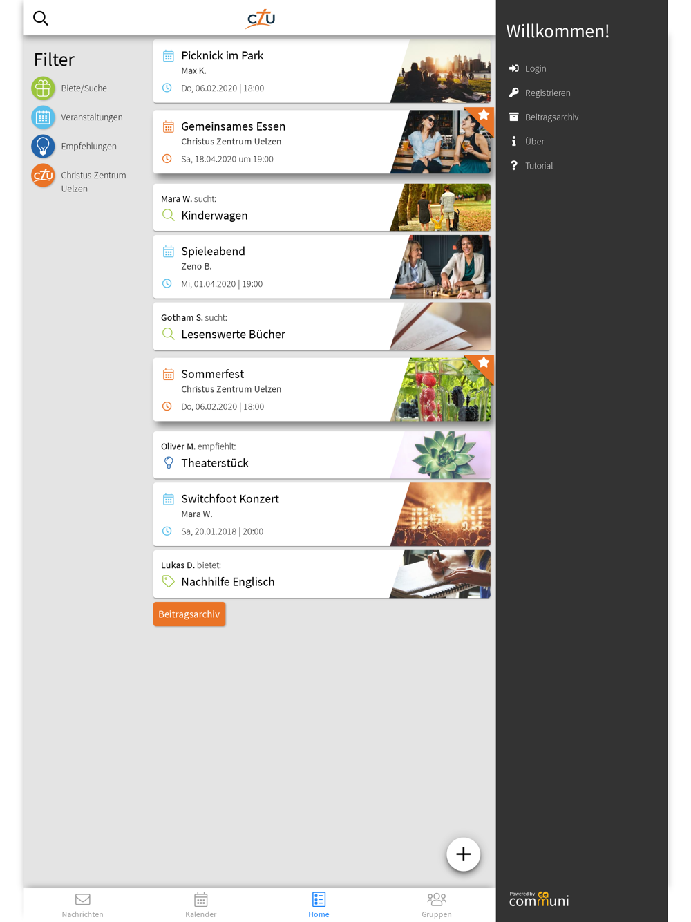 Unsere brandneue Community-App. Du willst dich mit Menschen in deiner Umgebung vernetzen, hast Lust auf Updates von uns, willst deine alte Mikrowelle verschenken oder suchst einen Wagenheber? Nichts leichter als das - die App sorgt für die optimale Vernetzung. Herunterladen, registrieren, einloggen, genießen!