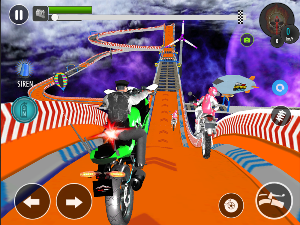 Impossible police bike stunts comes with super amazing police bike variations for stunt racing environment! Get ready to learn bike stunt skills to drive safely on tricky tracks of ramp bike racing. Unlock all exciting police bikes to have endless police bike racing to sharpen stunt racing skills.