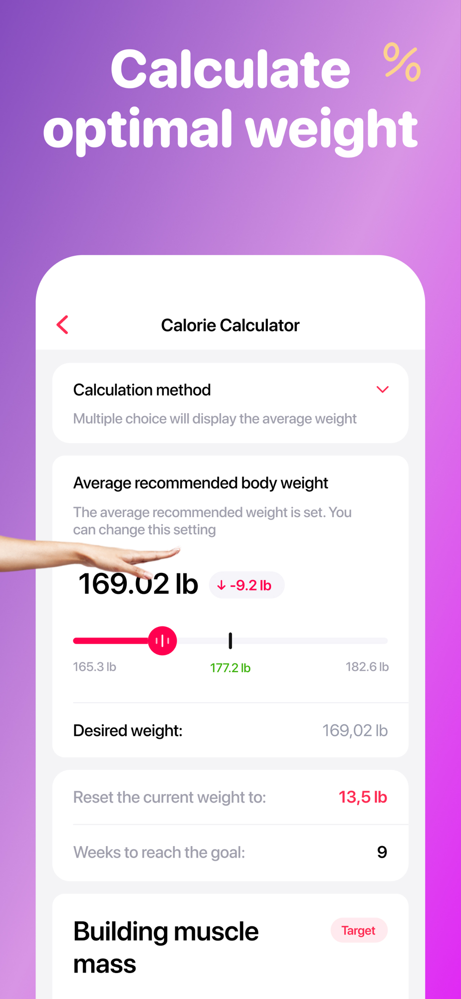- Adjustment for goals: gain, hold or lose weight