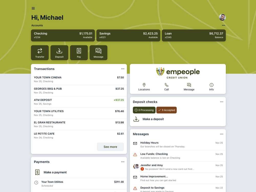 Empeople CU is your personal financial advocate that gives you the ability to aggregate all of your financial accounts, including accounts from other banks and credit unions, into a single view. It’s fast, secure and makes life easier by empowering you with the tools you need to manage your finances.