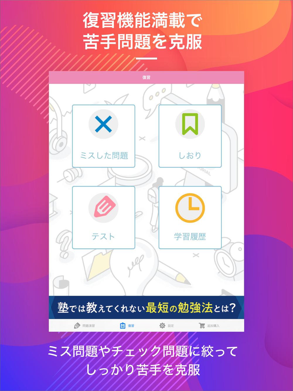 テスト機能はもちろん、ミス問題だけを復習、苦手な問題をチェックして、チェック問題のみ復習もできます。