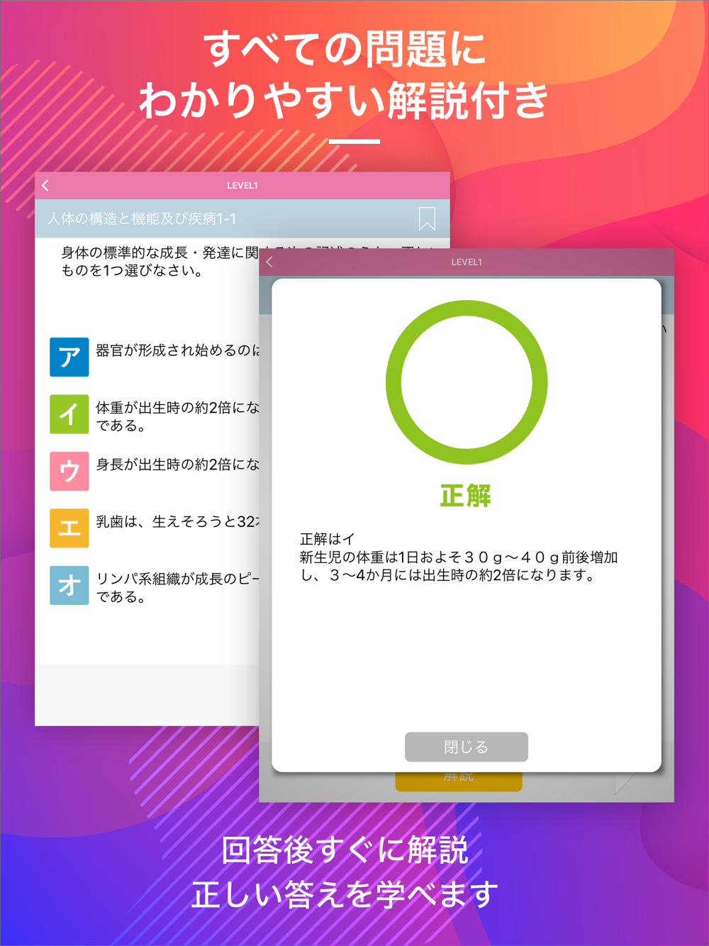 解説も充実し、アプリならではの隙間時間も逃さず効率的に勉強!これで次回試験もバッチリです!