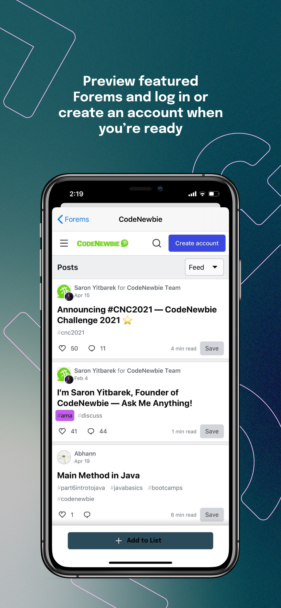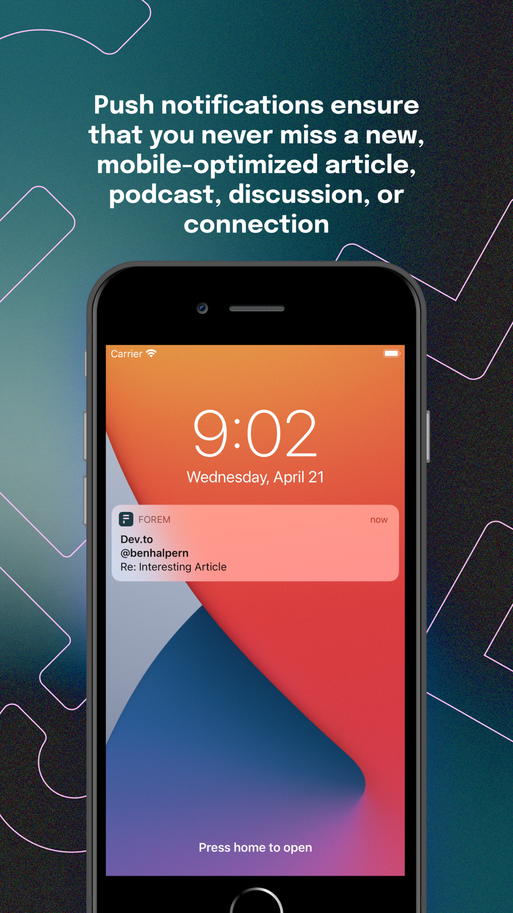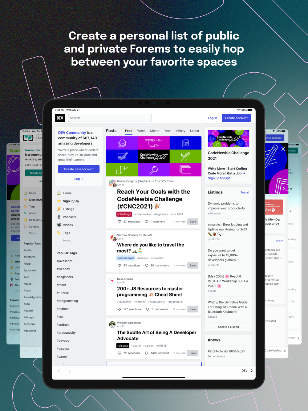 Stay active in the spaces you belong to on the go with the Forem app. Discover new Forem communities, build a list of the ones you know and love, and swipe between them for seamless participation. Push notifications ensure that you never miss a new mobile-optimized article, podcast, discussion, or connection.