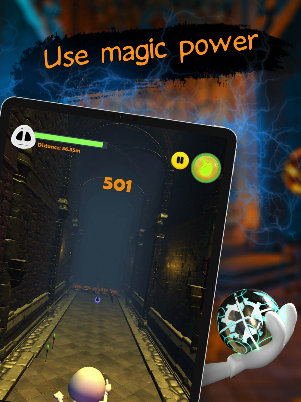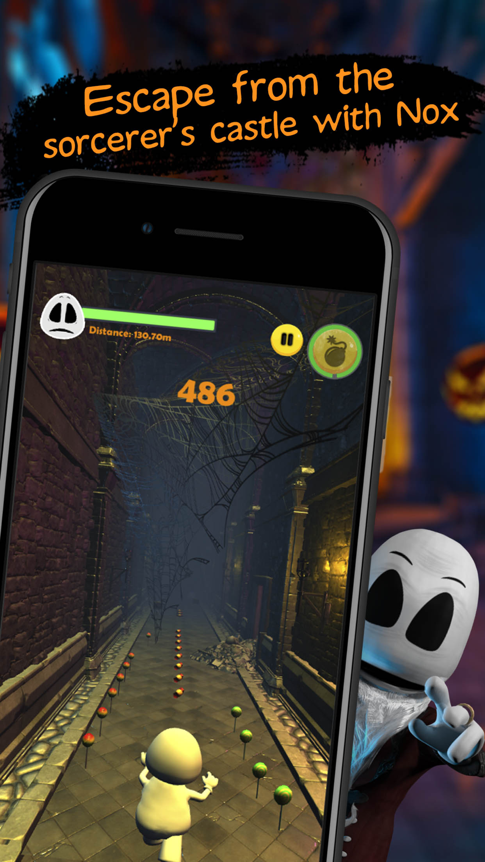 Help Nox escape by escaping through the corridors of the sorcerer's huge and sinister castle. Running through the corridors of the dungeon, through a trail of traps and also cute pictures of the sorcerer himself, who is watching you from the portraits on the walls.