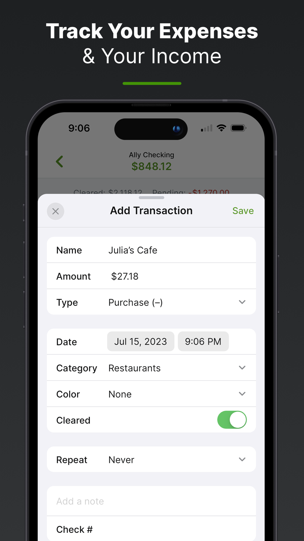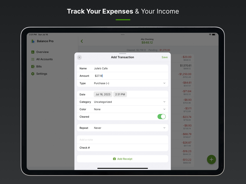 Keep track of transactions that are pending or have cleared. Quickly mark a transaction as cleared with a single tap of a button.
