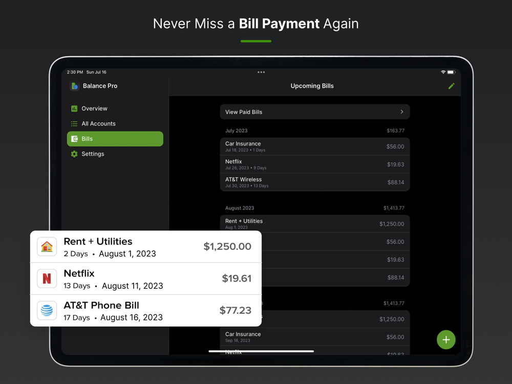 Balance Pro is a personal finance app that combines a digital checkbook register and bill tracker in one streamlined app. Effortlessly manage your money, track spending, receive timely bill reminders, and more.