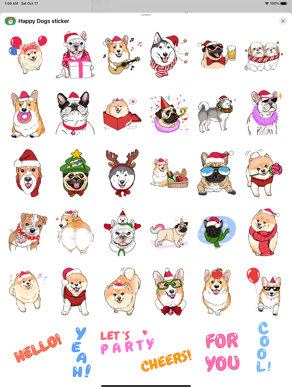 It's Holiday season, liven up your texts and messages with Pomeranian balloons, Husky deer, Pug tree, Santa Beagle, Corgi party, Frenchie gift & more lovely dogs stickers. Let them express your happy, warm and wonder feelings. Dog lovers should not miss. Woof Woof!