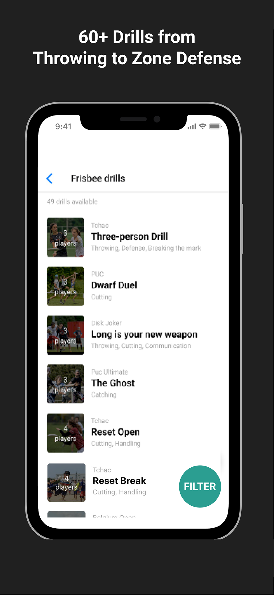 - Frisbee: Users will be able to draw inspiration from the best exercises put in place by experienced coaches. These exercises, described by animations and/or videos, have also been grouped by us into training programs. By following these programs, you will be able to easily structure your season to help your team acquire new skills.