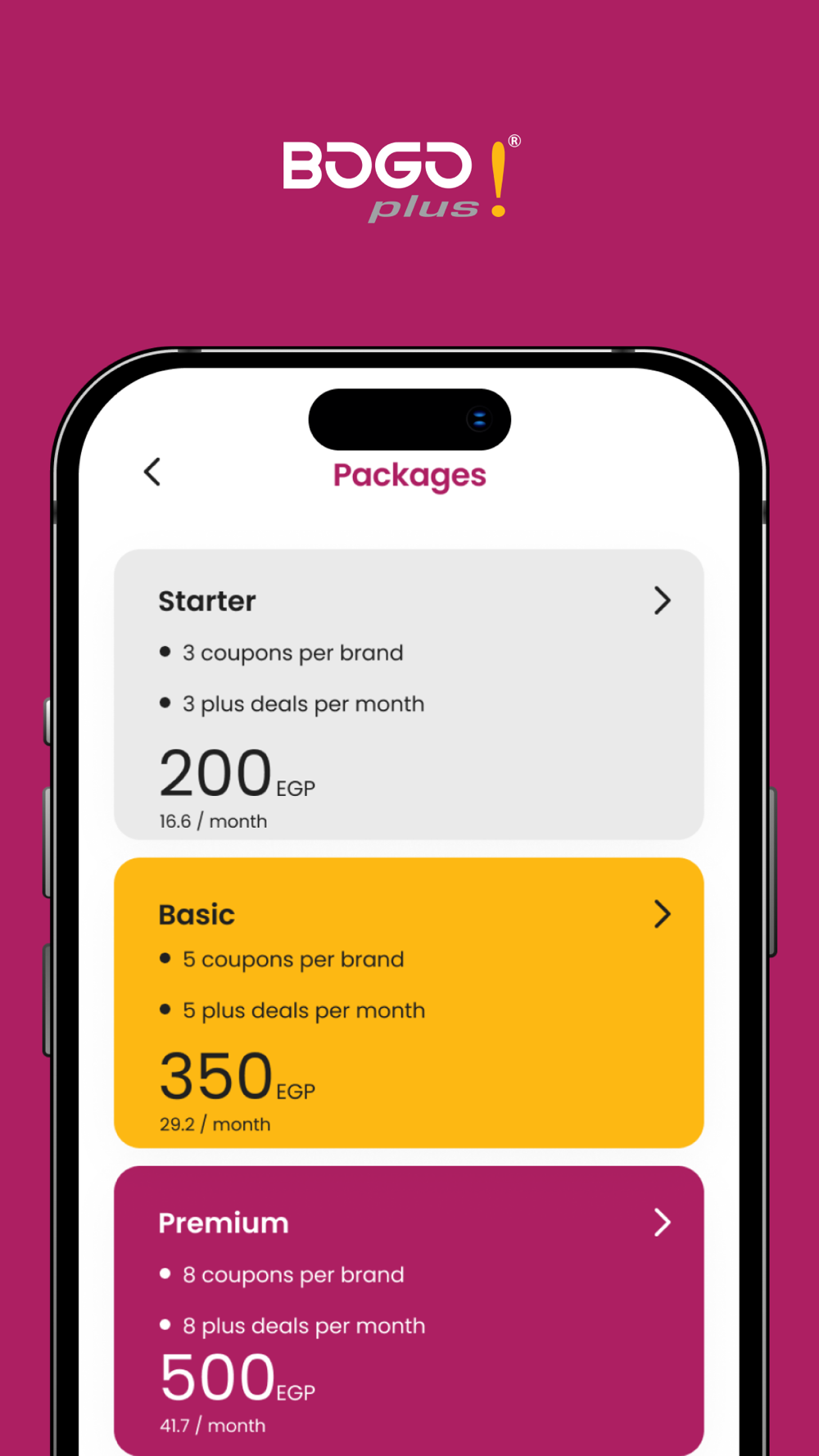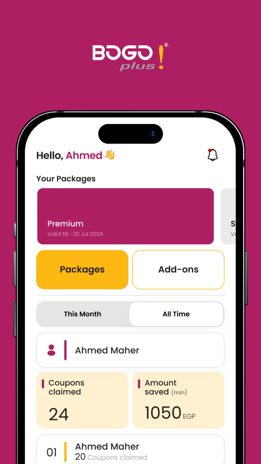BOGO plus application offers you different packages with different benefits where you can choose from them as per your needs in addition to the unique features of the App like Leaderboard, plus deals, add ons and coupon transfer feature.