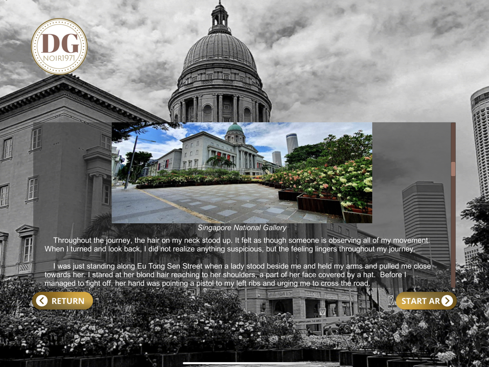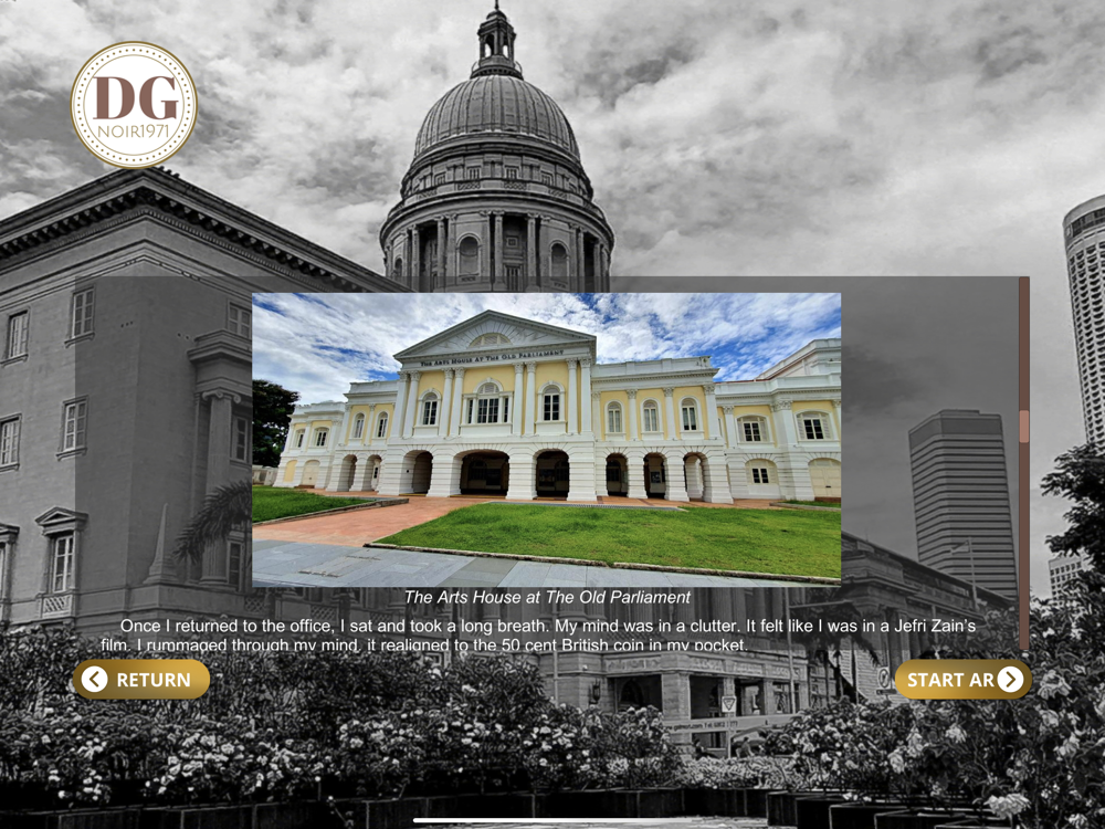 DGNoir 1971 is an AR-capable mobile phone application, based on the short story titled ‘Noir 1971’ by Hassan Hasaa’Ree Ali. Users will be able to read the story and experience the story further when they take certain images of locations around the modern-day Singapore River. These images will turn into videos that will show Ahmad Zaidi, the protagonist, uncovering the mystery of an object he received from a stranger.