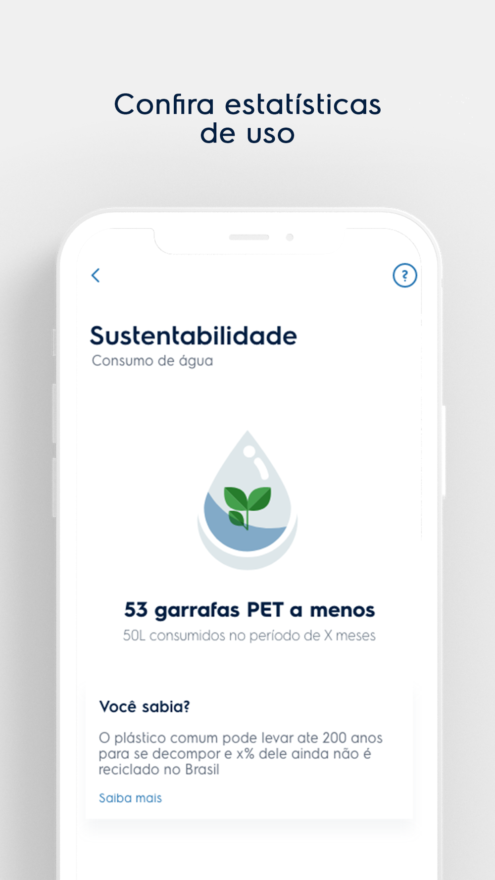Na parte de estatísticas você encontra informações sobre o consumo de água pelo dispenser da porta. Descubra o impacto sustentável que isso gera no meio ambiente.
