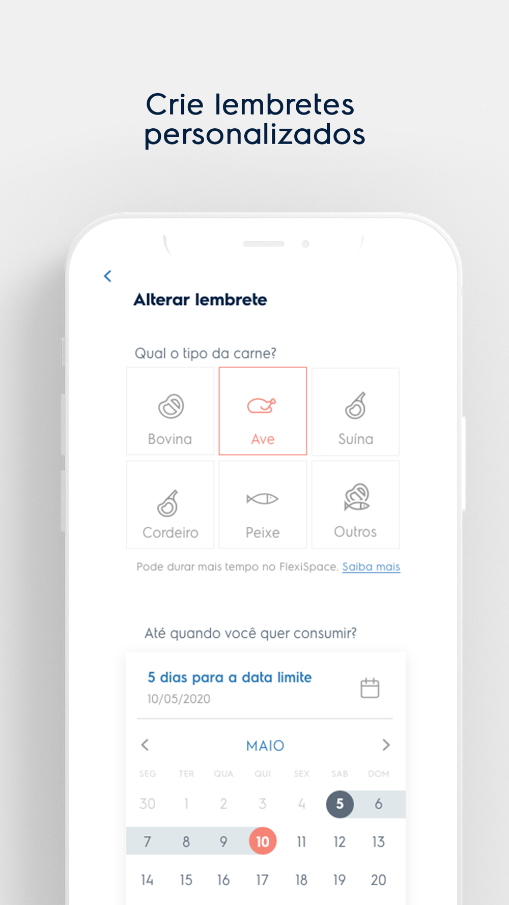 Explore o FlexiSpace e use a função Lembretes para consumir alimentos dentro do prazo e evitar desperdícios. O aplicativo te ajuda a lembrar de consumir ou de congelar para um prazo mais longo de consumo.