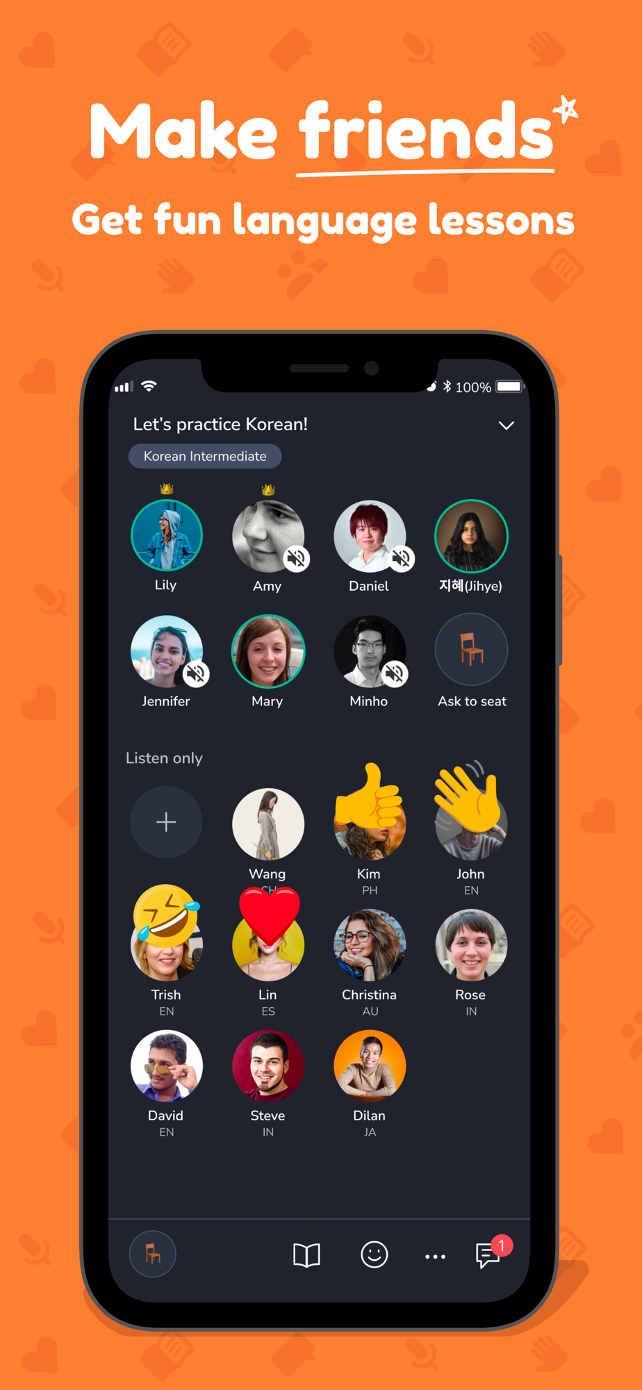 2. Not ready to speak? No problem. You can choose to be a listener or participate in written chat messages with images and emojis.