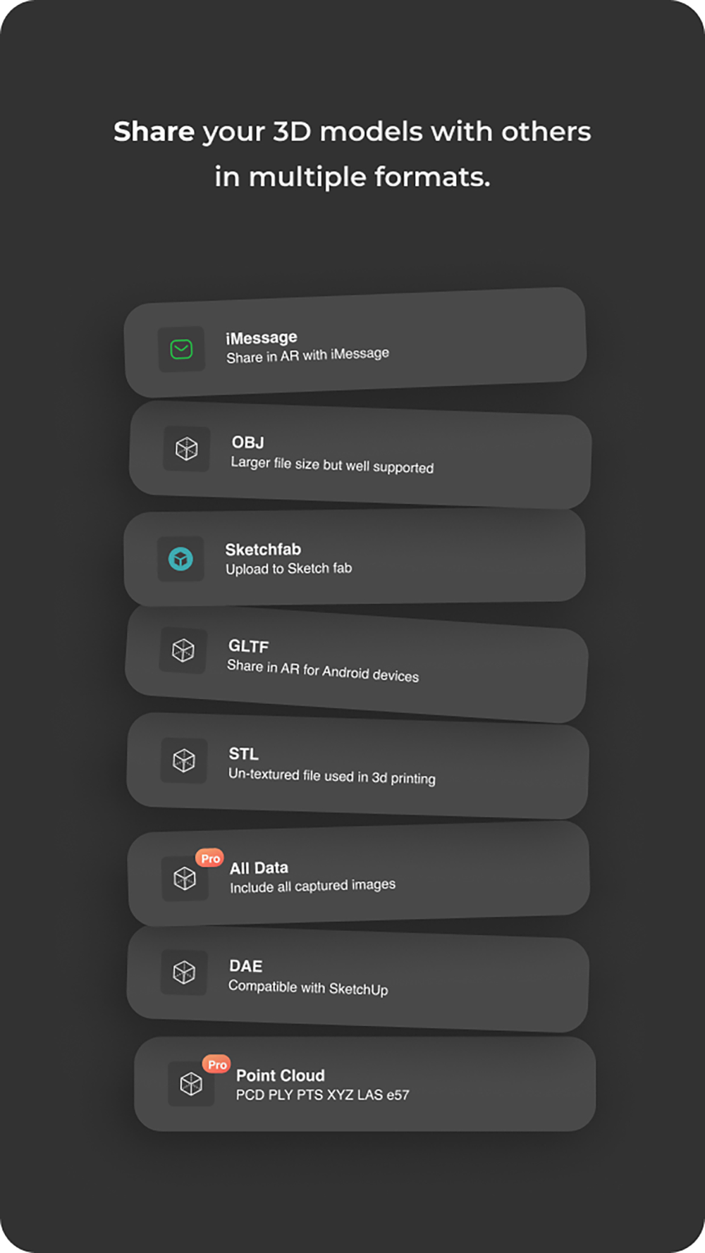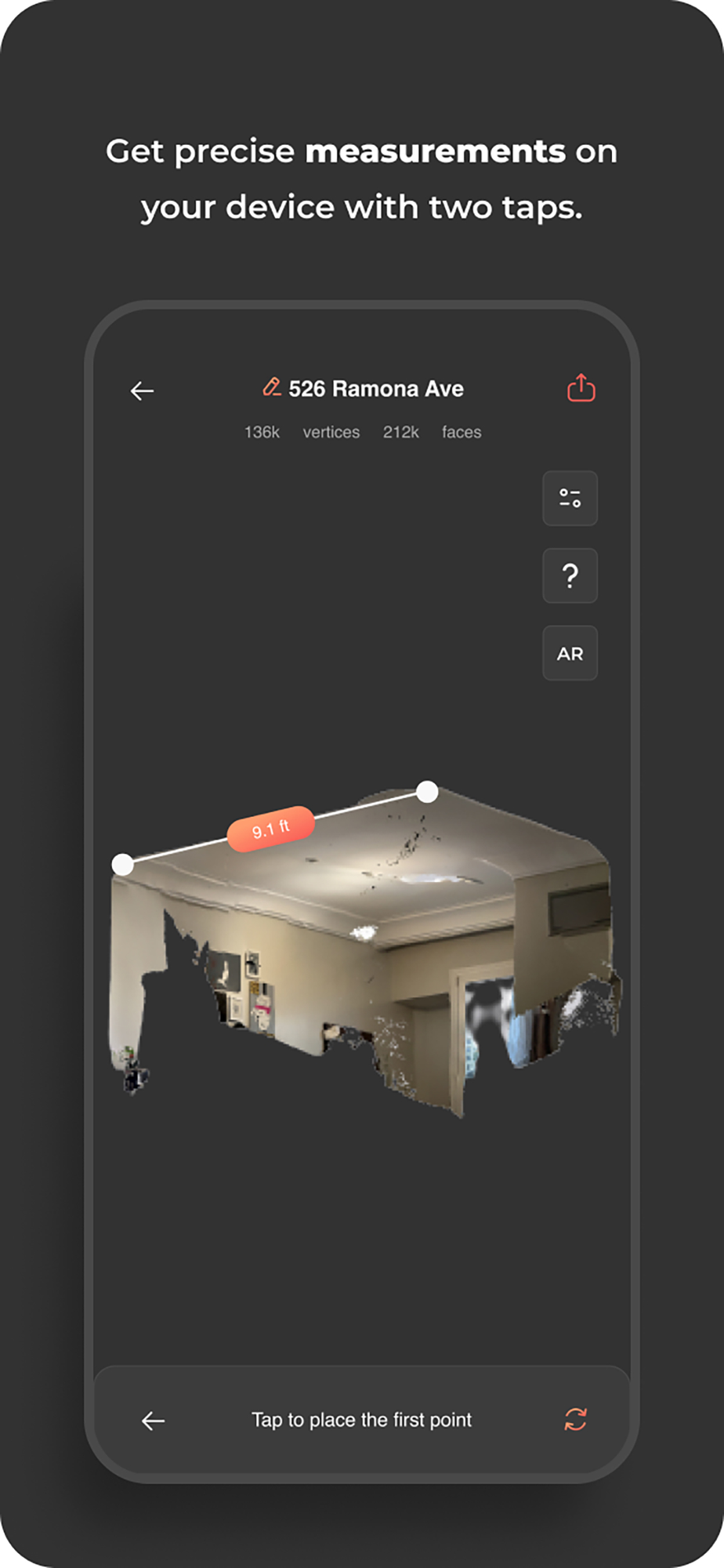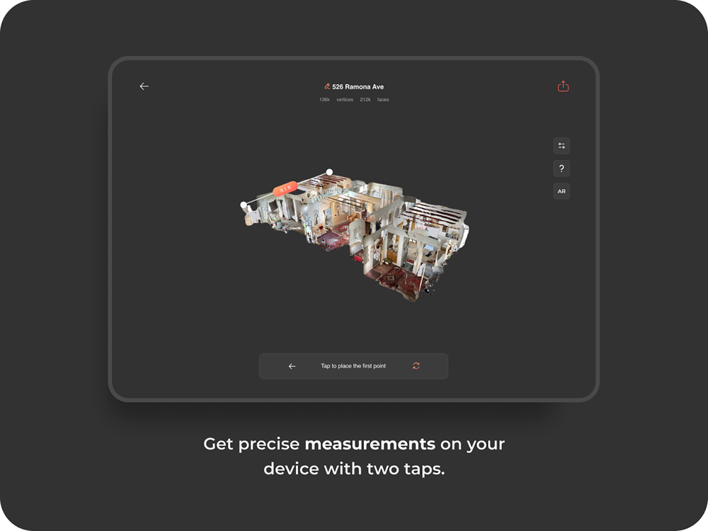 Our ScanTo3D App, together with cloud-based analysis, quickly generates an accurately measured and labeled 3D CAD and floorplan of a property. This app allows you to create 2D Floorplan and Gross Living Areas (GLA).