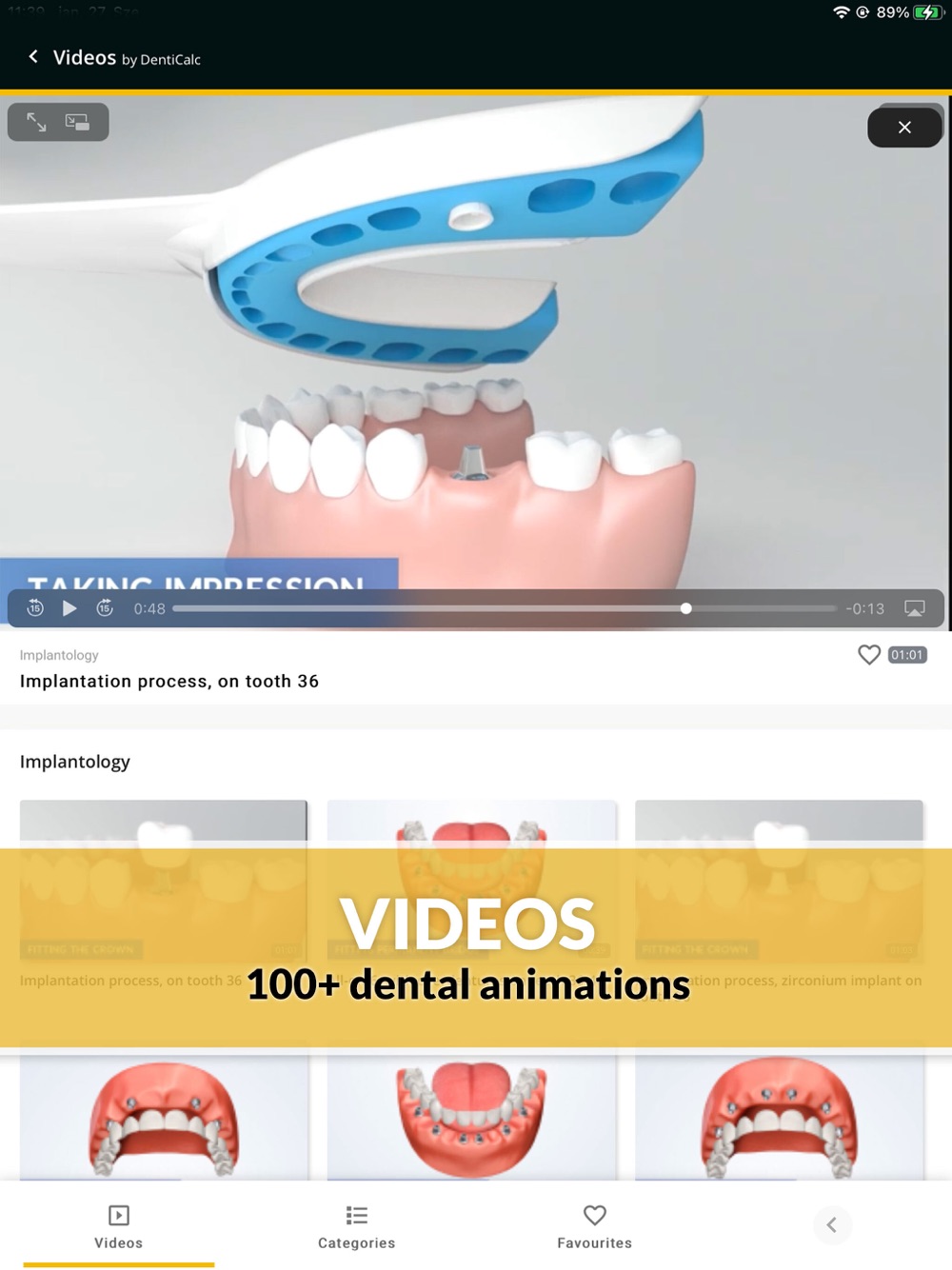 Visual communication aid that is a great help in explaining problems and treatment procedures. Patients will understand treatments better with the help of patient education videos, treatment visualizer, and dental animations, so less time can be spent on explaining the procedures. New videos are added each month to show more specific cases and to offer different treatment solutions to a problem. The app can also be useful for students as they can visualize various treatment procedures which can be helpful during their studies.