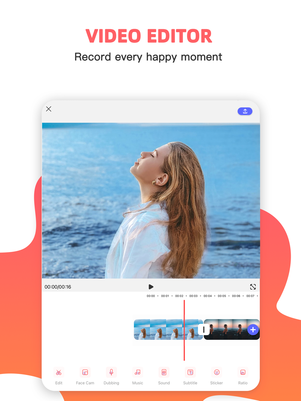 It's your powerful kits for slideshow creating, short video splicing, video cutting, video speed changing, video rotation, recording dubbing, adding sound effects, adding subtitles, adding stickers and adjust video volume, etc.