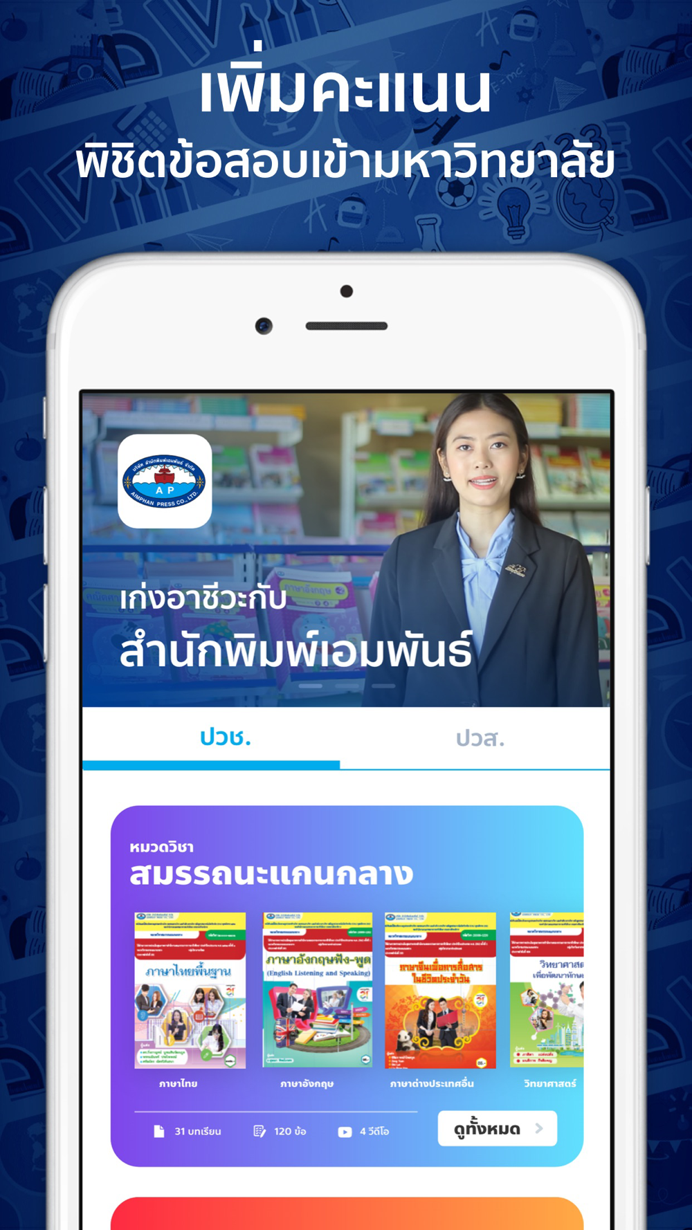 Aimphan Press คือแอปพลิเคชันการเรียนรู้ระดับชั้นอาชีวศึกษา ด้วยเนื้อหา วิดีโอ แบบฝึกหัด และคลังข้อสอบ ที่จัดทำโดยผู้เชี่ยวชาญแต่ละสาขา ใช้ประกอบการเรียนการสอน และการเรียนรู้ด้วยตนเอง ใช้ได้ทุกที่เรียนได้ทุกเวลา