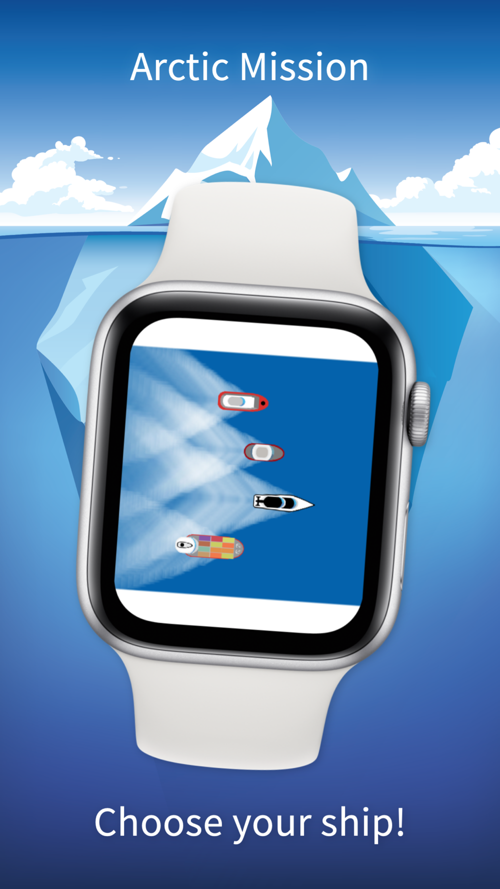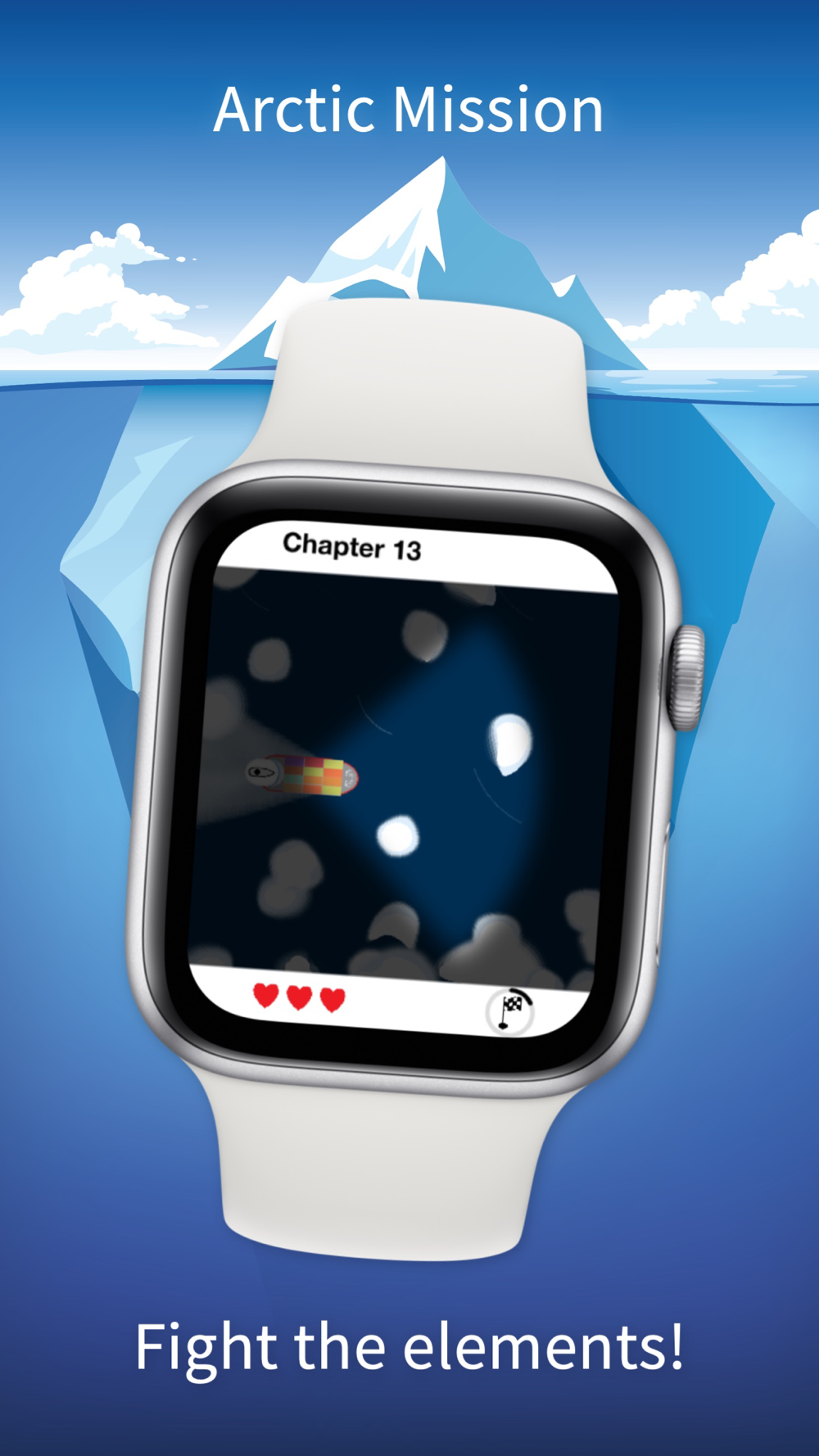 Arctic Mission features a little story with 2 missions, 5 different "ships" to play through 16+10 chapters with various weather conditions. It is the best way to kill a few minutes on your wrist since our first Apple Watch project: Radar Game.