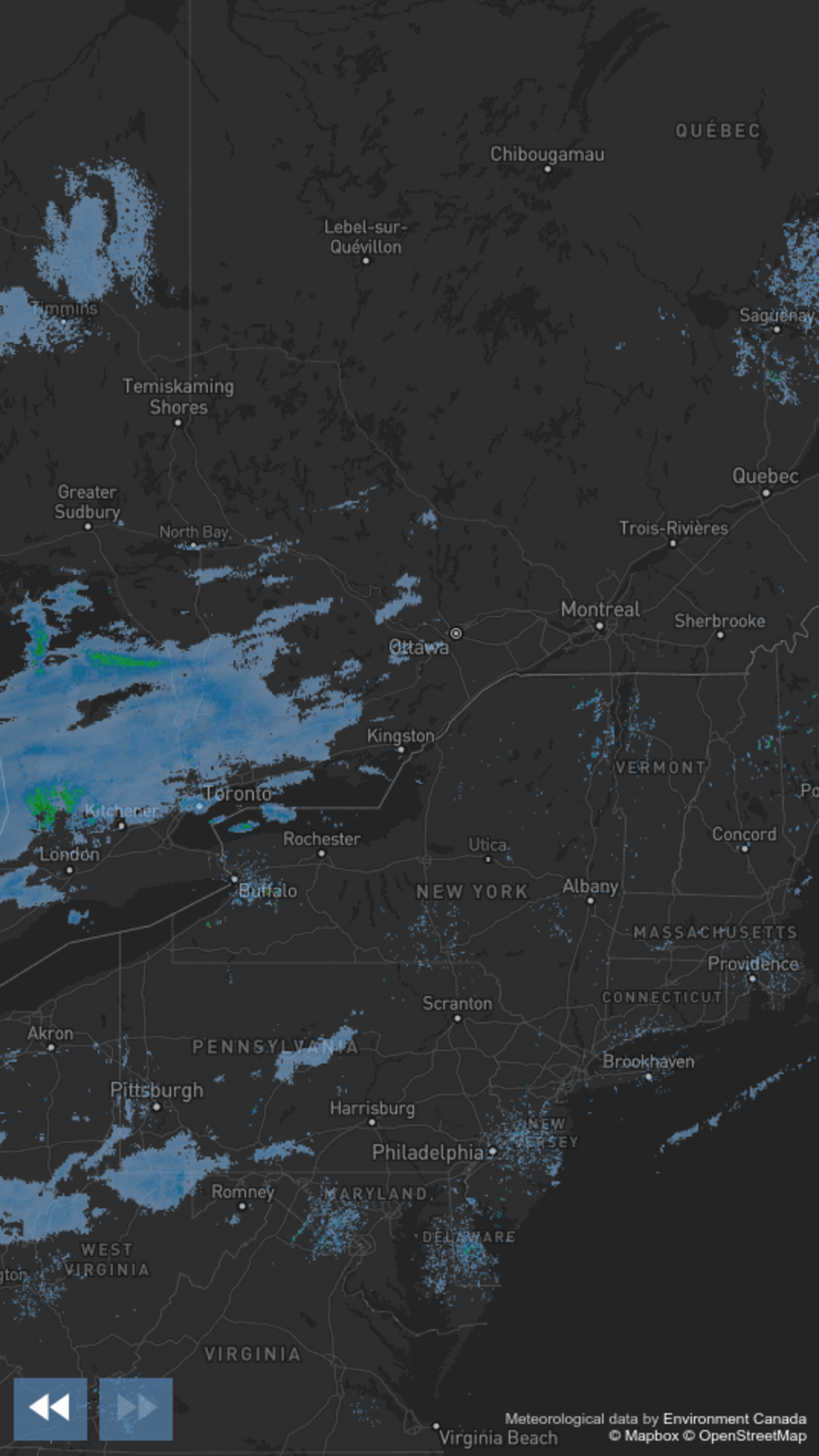 TruWeather is a near realtime precipitation map of North America. It shows the current precipitation and 3 hours of historical data from Environment Canada's high resolution radar system.