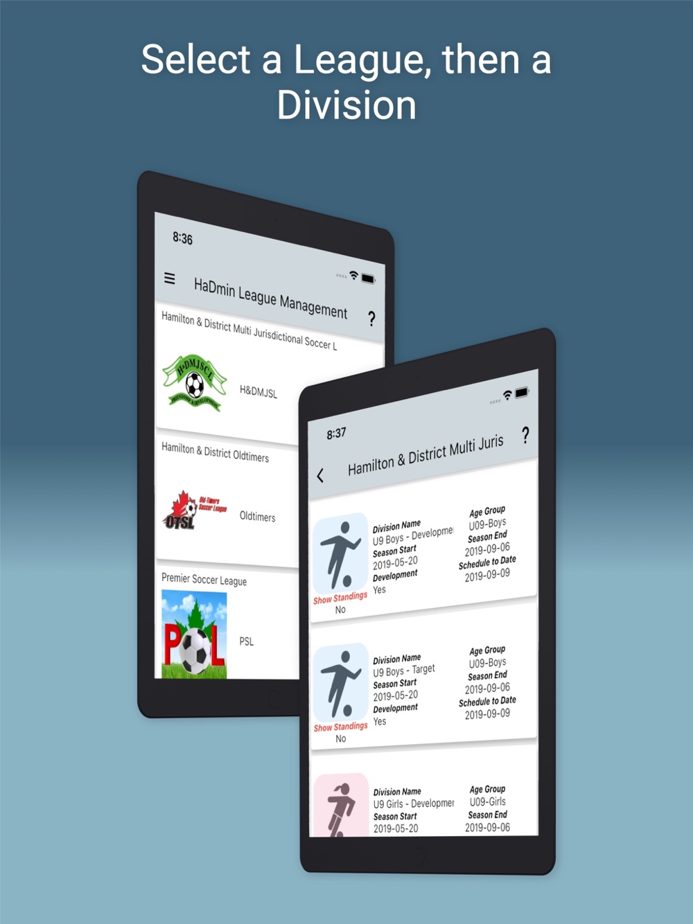 The HaDmin app presents the end user view of what is happening within HaDmin the Soccer League Management system utilized by Hamilton Soccer.