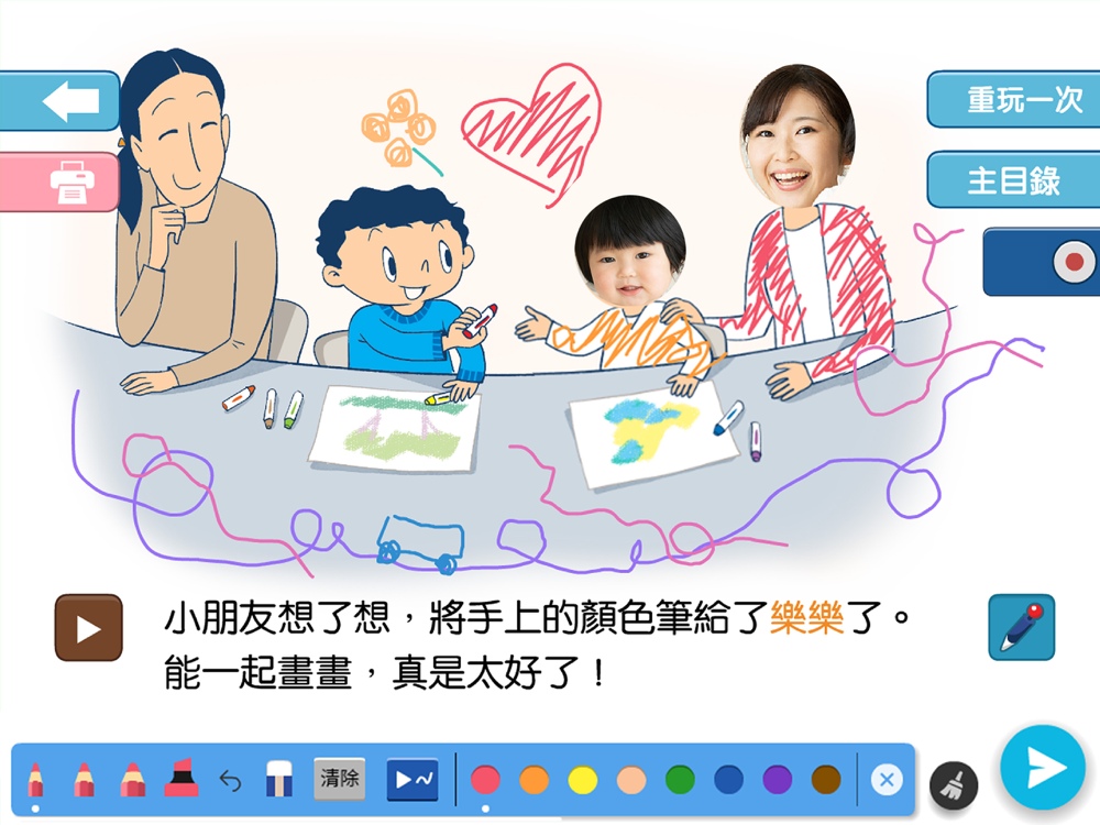 此外,以上故事亦化身為親子互動繪本,家長透過程式的攝錄功能,加入家人頭像及聲音,讓孩子更能投入故事.孩子亦可運用程式的填色功能進行創作,與家長製作出屬於自己的獨一無二的繪本.增添趣味之餘,也讓孩子提升理解及運用。