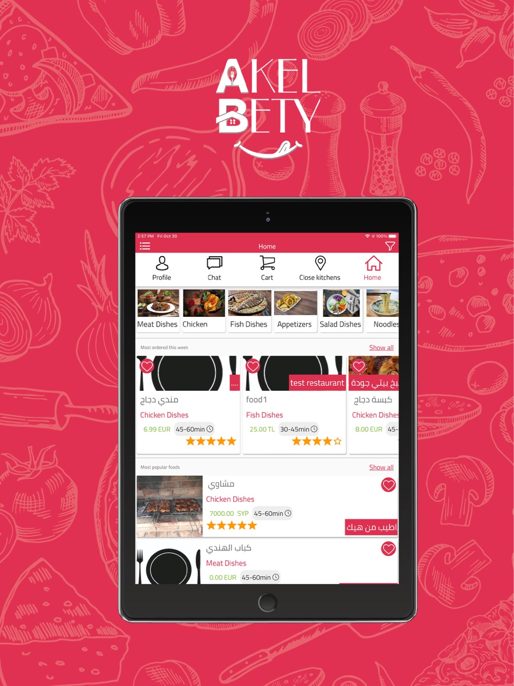 With the "Akelbety" application, you can display all your foods to a wide range of users, to shine among them with your delicious dishes, and requests from everywhere, to achieve a wonderful financial income