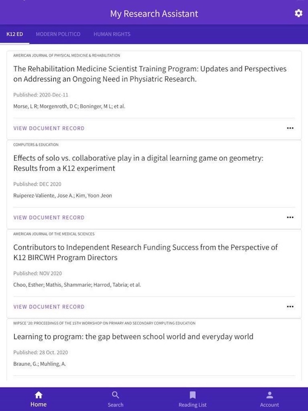 Introducing Web of Science™ My Research Assistant, a mobile app that gives you access to the Web of Science and the Master Journal List wherever you are. Quickly search and save research from the world's leading journals, create a curated feed of the research you care about most, and easily share articles with colleagues – all from your smartphone, wherever inspiration strikes.