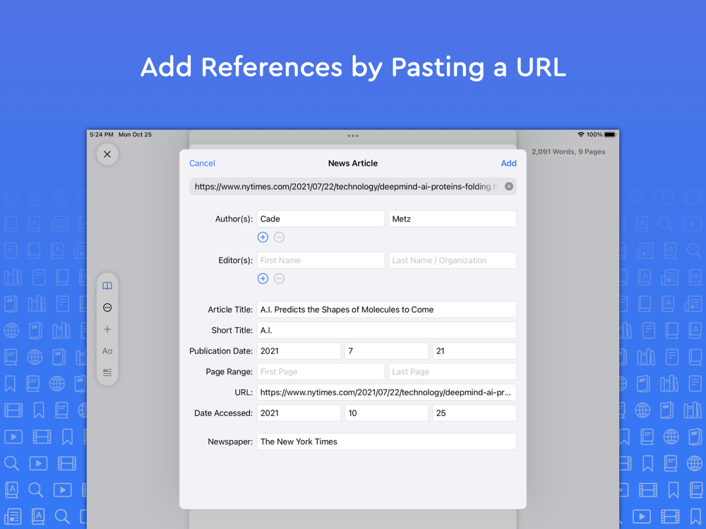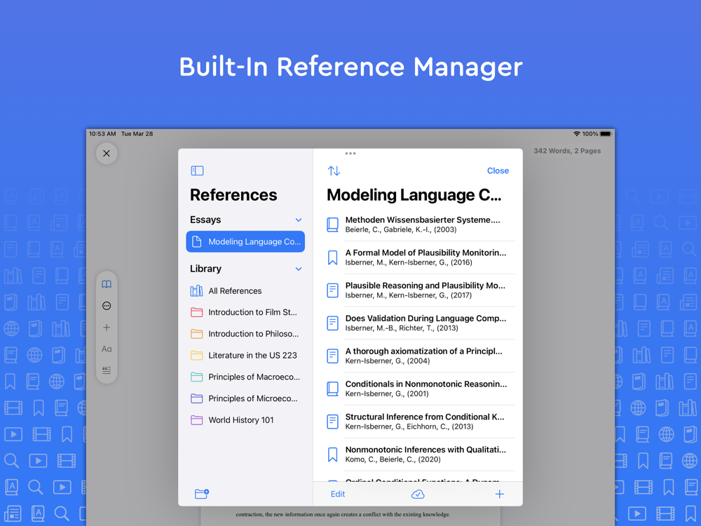 Store and manager references in a universal reference manager backed by iCloud. Search for, add, and store references in one place and use references across multiple essays. Create separate collections (folders) within the reference manager to organize and manage references. Add references quickly and easily using Google Scholar, Essayist’s built-in search, by pasting a URL or manual entry forms. Once added, references are automatically formatted and added to your essay’s references/works cited list.