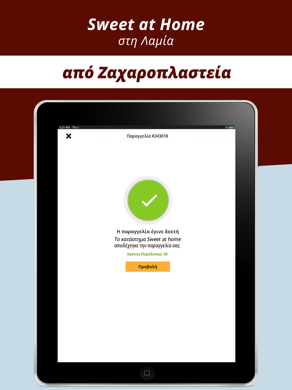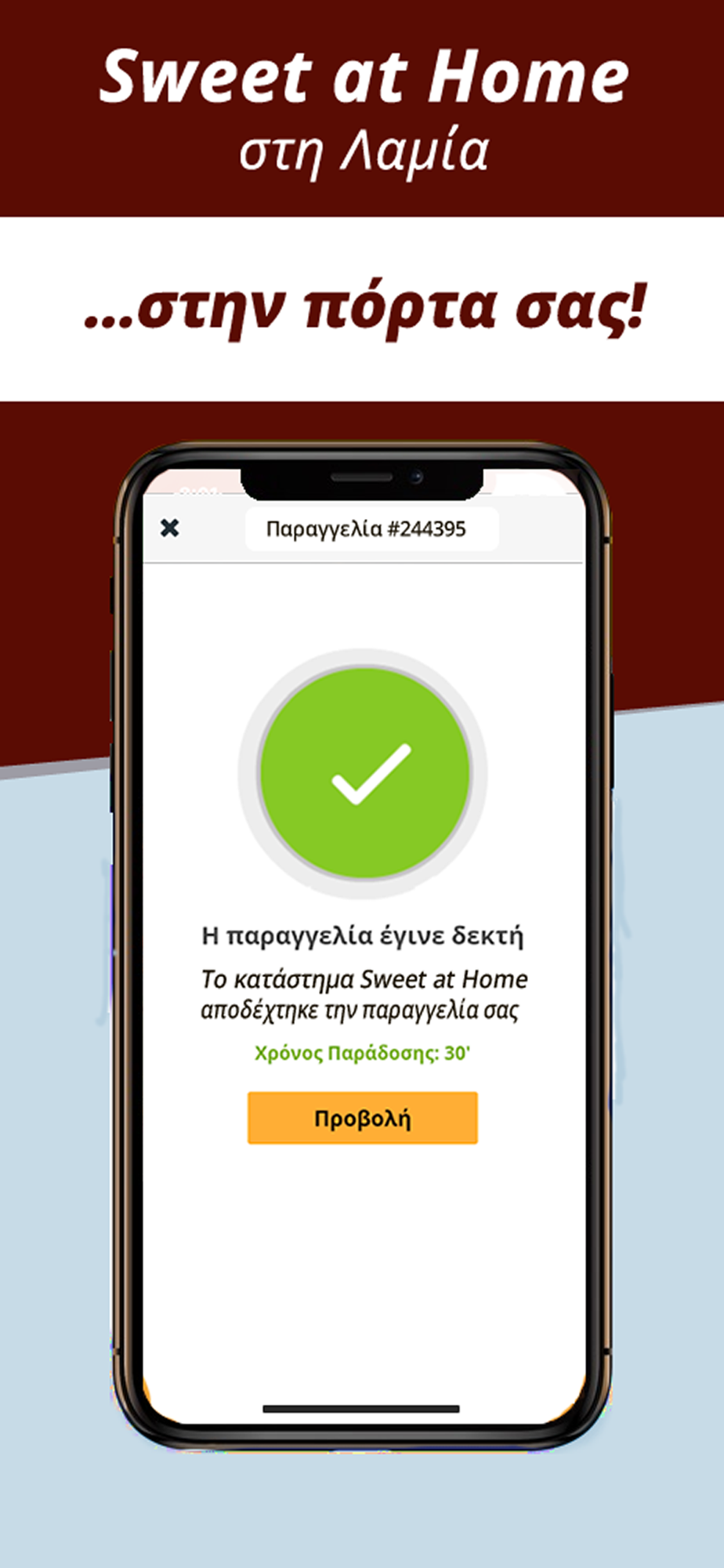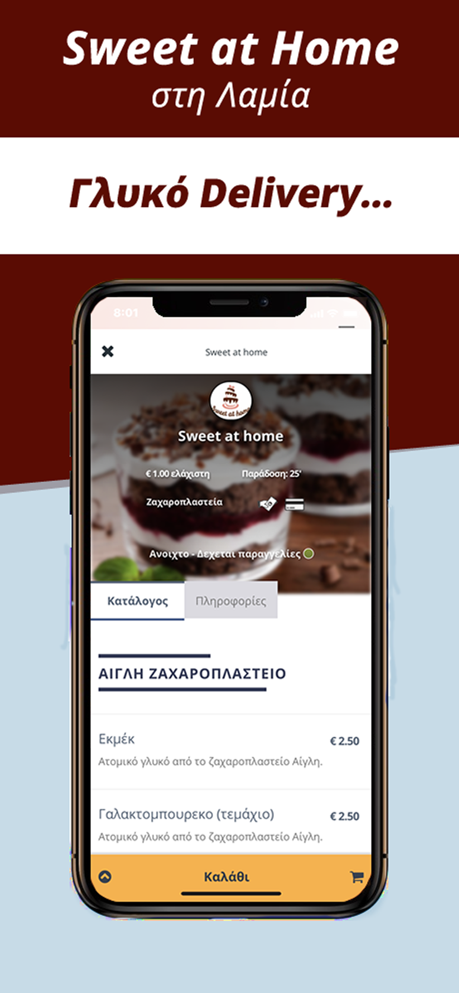 Κατέβασε την εφαρμογή, δες τα συνεργαζόμενα ζαχαροπλαστεία και παράγγειλε το γλυκό της αρεσκείας σου. Στο φέρνουμε εντός λίγων λεπτών... στη πόρτα σου!